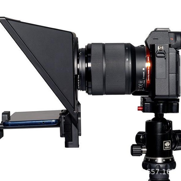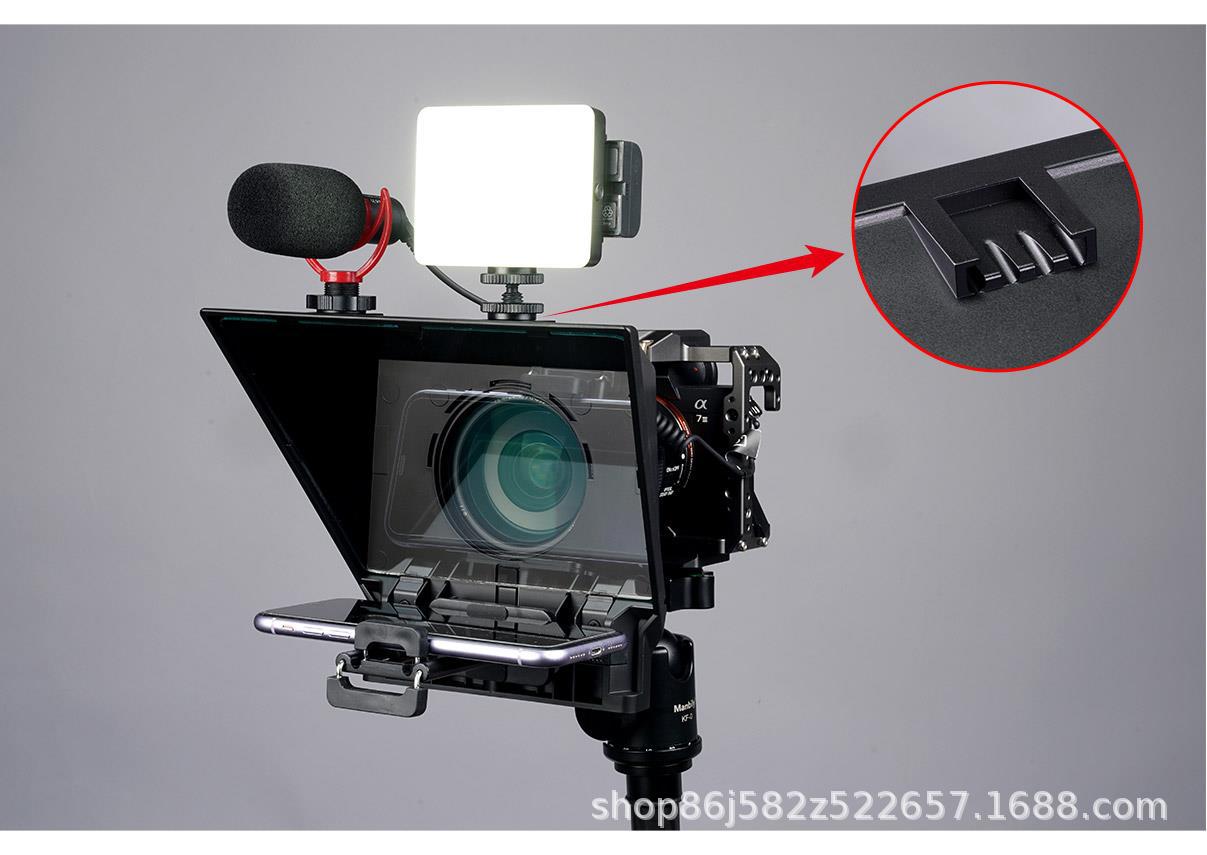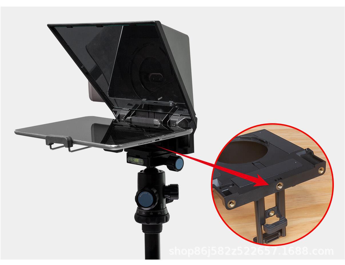 提词器底部有三个标准1/4螺丝口,可接三脚架、灯架等。