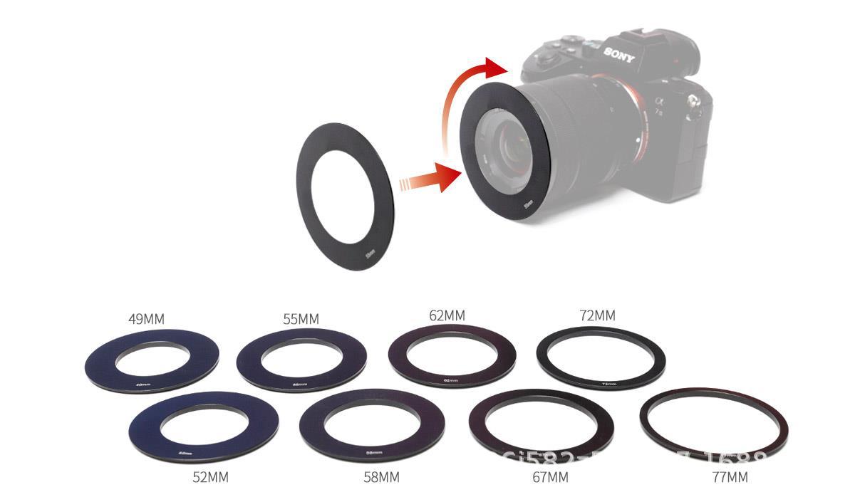 TP2 标配49/52/55/58/62/67/72/77mm 8个镜头转接环,可以选择适合您相机镜头的转接环。