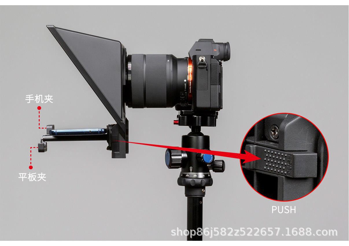 TP2 配备了手机/平板双用支架,当您需要用手机或平板提词时将适用手机或平板的一面装到提示器上,然后向左推动“PUSH”锁扣即可将支架锁住。不需要时向右推动“PUSH”锁扣即可将支架拆卸。操作简单快捷。