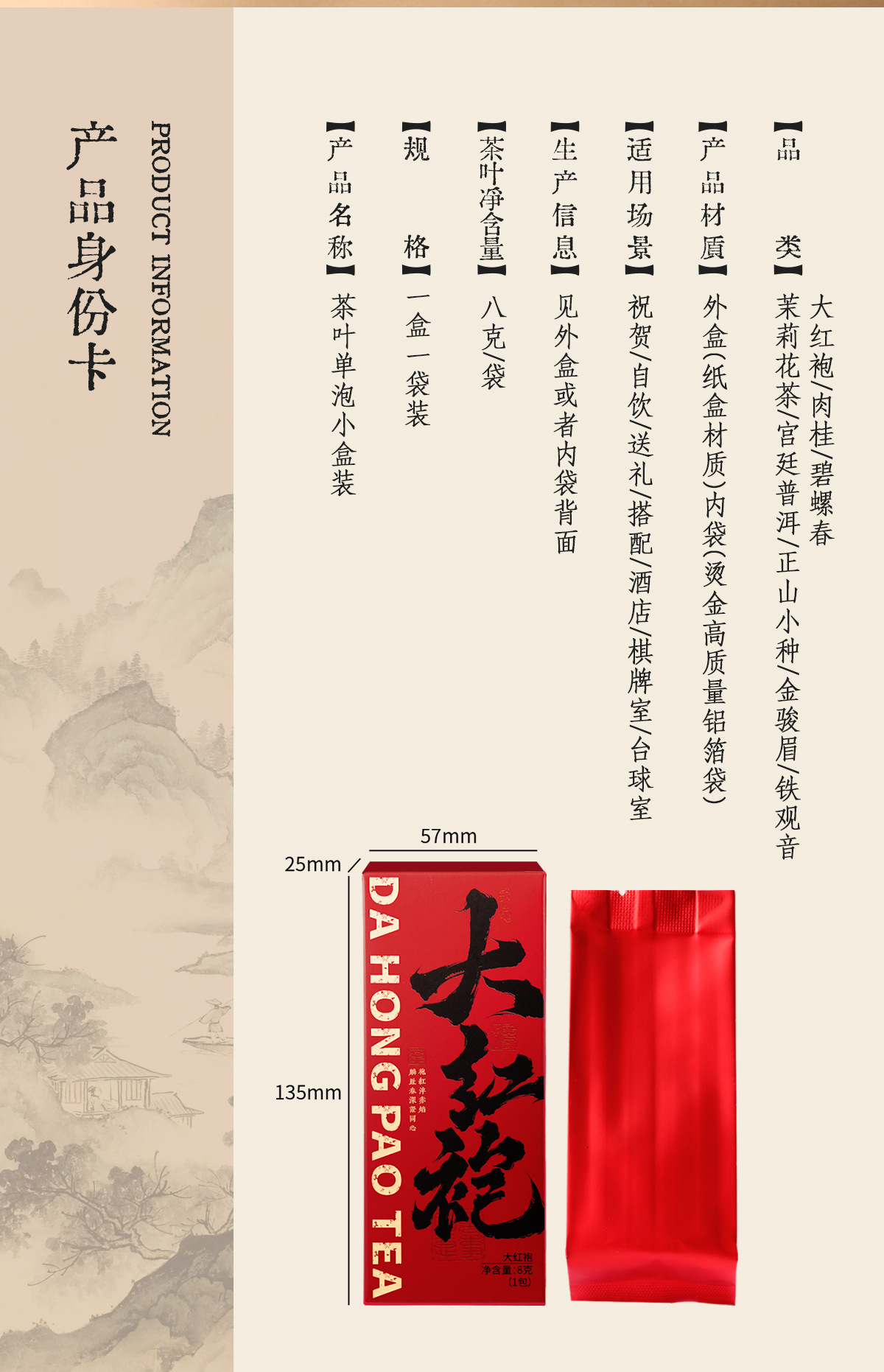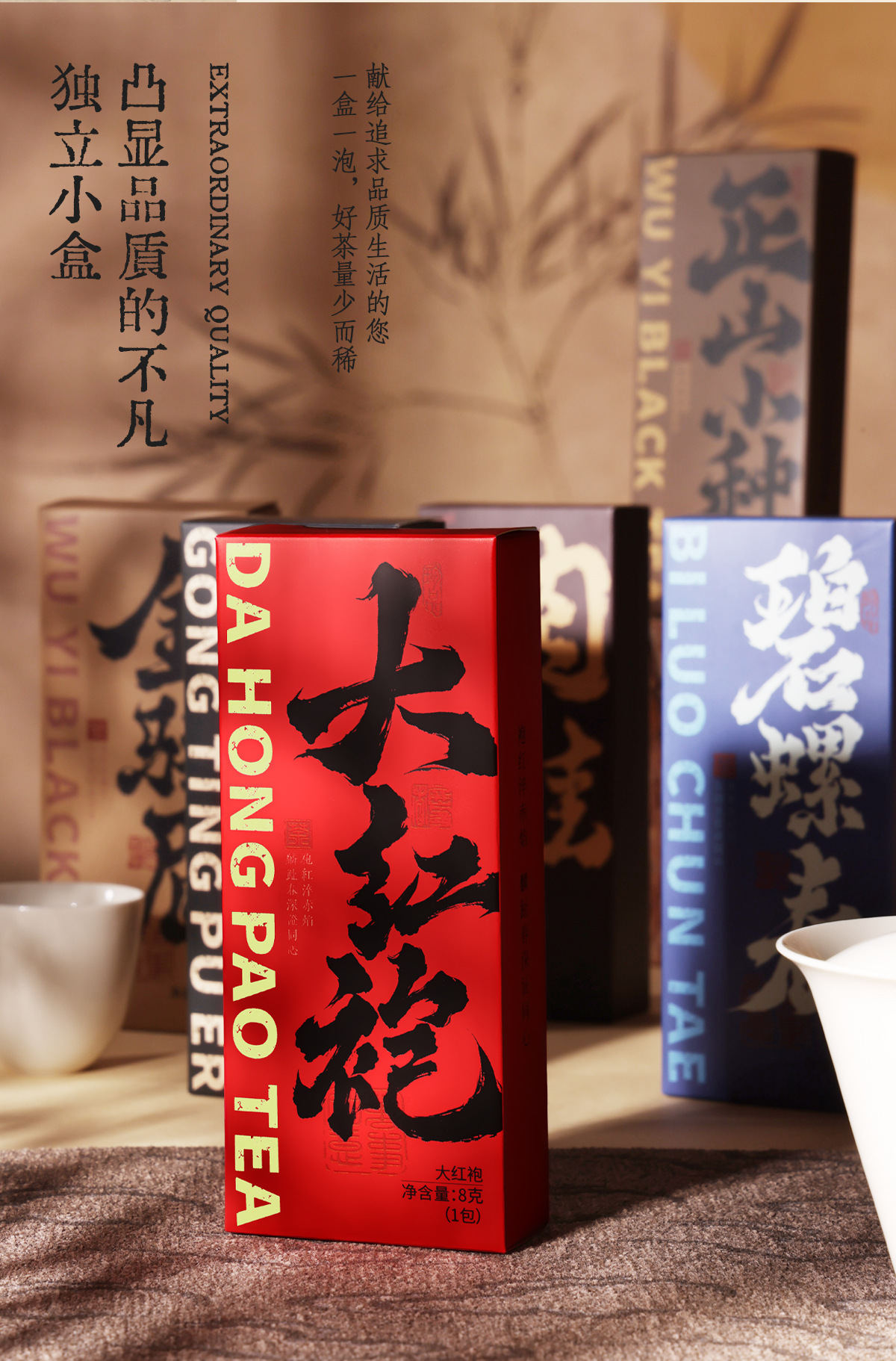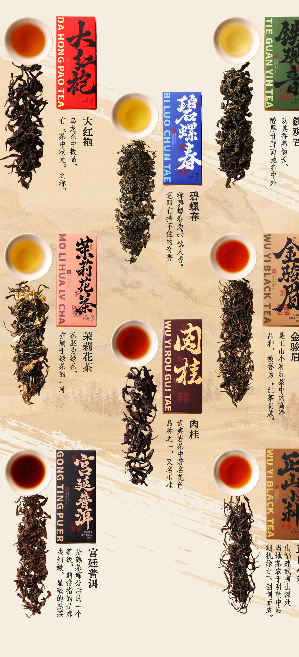 Dahongpao-8g (содержит один пакет в индивидуальной упаковке); Корица – 8 г (в одной упаковке); Jinjunmei-8g (содержит один пакет в индивидуальной упаковке); Тиегуаньинь-8г (входит в индивидуальную упаковку один пакетик); Билюочунь-8г (в одной упаковке); Лапсанг Сучонг — 8 г (в одной упаковке); Жасминовый чай – 8 г (в одной упаковке); Палас Пуэр-8г (входит один пакетик в индивидуальной упаковке); Дахунпао [Содержит два маленьких пакетика по 8 г - 16 г]; Золотая Бровь [Содержит два маленьких пакетика по 8 г - 16 г]; Лапсанг Сушонг [Содержит два пакетика по 8 г - 16 г]; Жасминовый чай [содержит два пакетика по 8 г - 16 г]; Чай Феникс Дань Конг Улун [Включает два пробных пакетика по 8 граммов - всего 16 граммов]; Исландский чай Пуэр [Содержит два мини-пакетика по 8 граммов - всего 16 граммов]; Банчжан Пуэр [Содержит два пакетика по 8 г - 16 г]; Палас Пуэр [Содержит два маленьких пакетика по 8 г - 16 г]; Персиковый улун [Содержит два пакетика по 8 г - 16 г]; Чай с османтусом [содержит два пакетика по 8 г - 16 г]