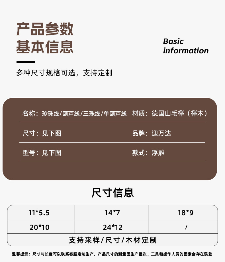 11*5,5 мм (цена 1m шт.); 14*7 мм (цена 1m шт.); 18*9 мм (цена 1m шт.); 20*10мм (цена 1m ); 24*12 мм (цена 1m цена); Поддержка выбора образца/размера/дерева