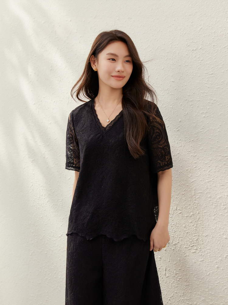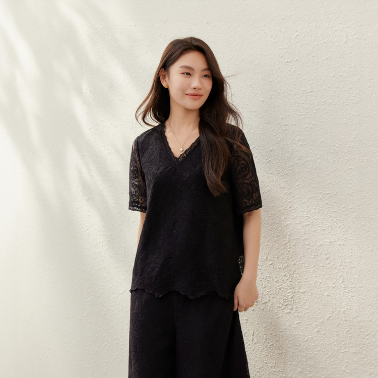Абрикосовый цвет [кружевная рубашка QK1773]; Черный [Кружевная рубашка QK1773]; Абрикосовый цвет [Брюки QK1778]; Черные [Брюки QK1778]