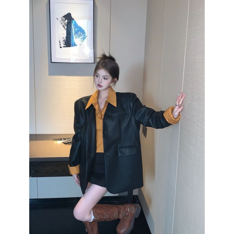 Кожаная куртка с длинным рукавом с воротником polo, женская осень-зима 2025 новый ретро-портовый дизайн