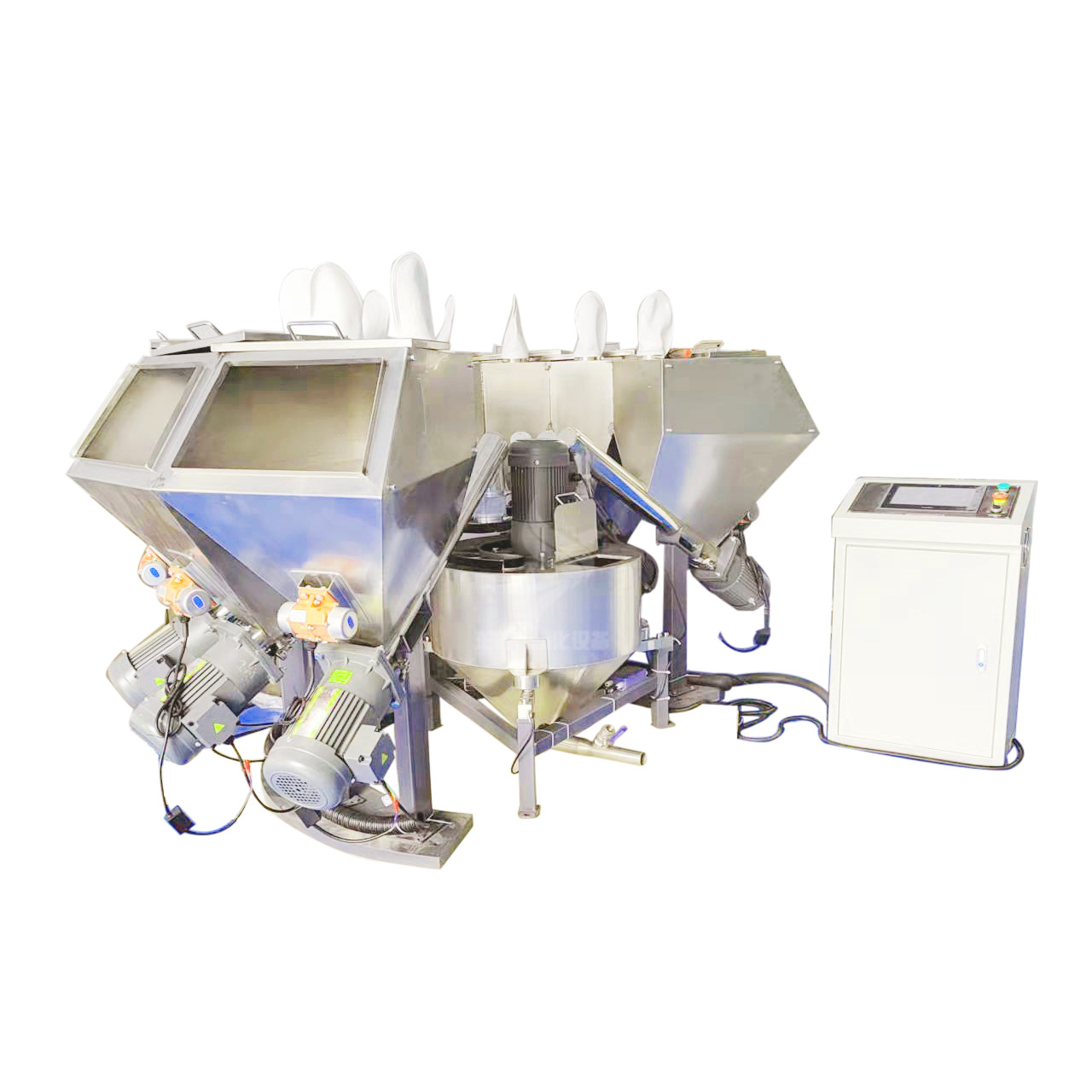 采用先进的PLC触屏控制系统,称重传感器+高精度喂料器代替人工称重配料,配料精度加大的,对产品品质有益。