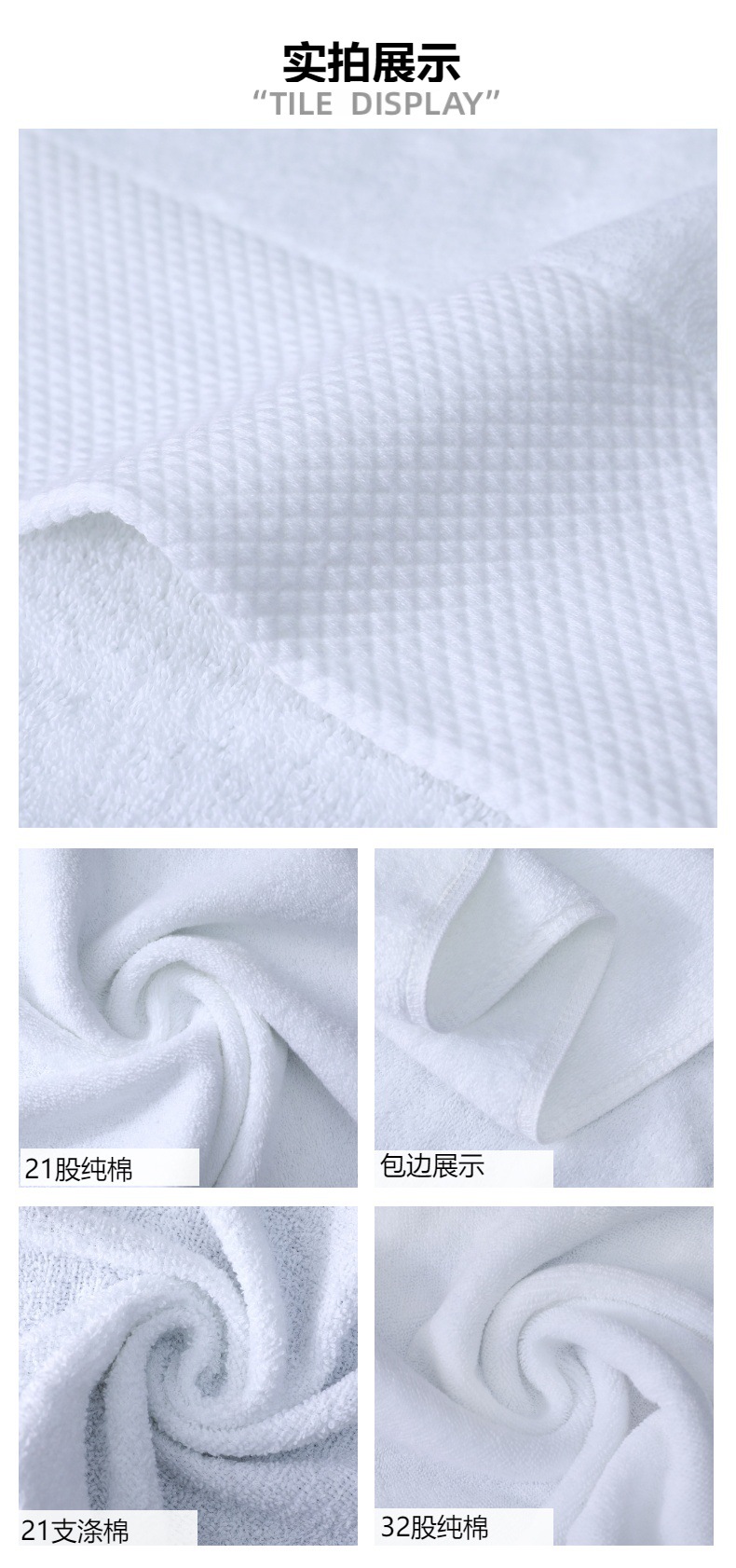 21 акция Importpure Cotton (сеть отелей, салон красоты); 32 нити хлопка Importpure (тоньше 21 нити); 16с спираль шерстяная полотняная (пятизвездочный отель); Спиральные волосы из платинового сатина 16s (пятизвездочный отель); Белое полотенце из полиэстера и хлопка, 21 шт.