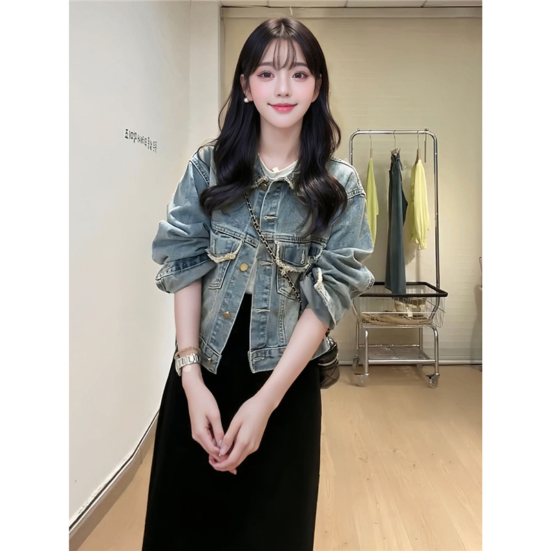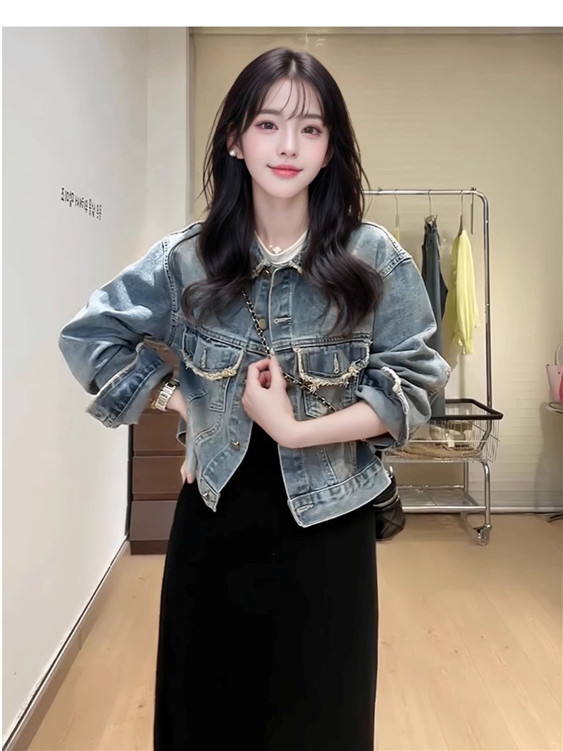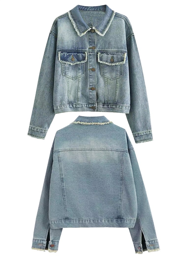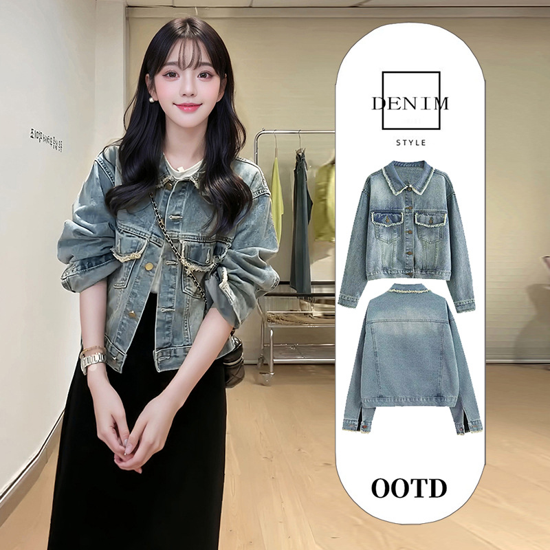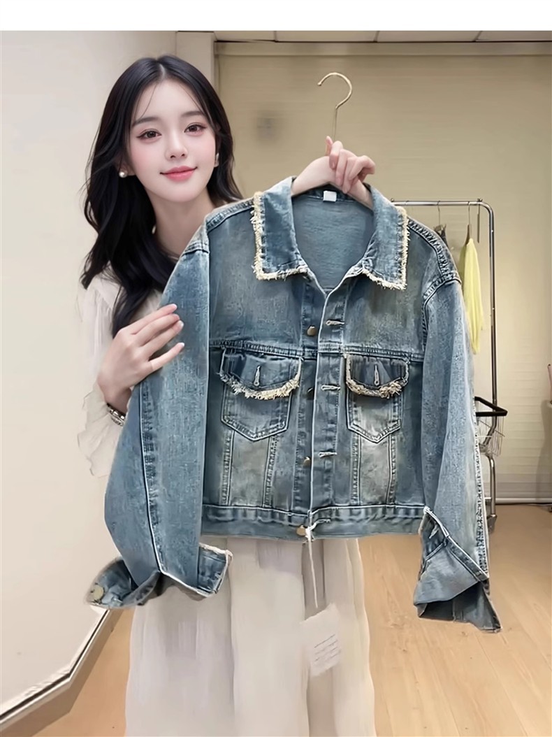 Джинсовая куртка с необработанными краями для женщин весной и осенью. Горячий стиль интернет-знаменитостей в американском ретро, свободная куртка с длинными рукавами и лацканами, шикарный топ.