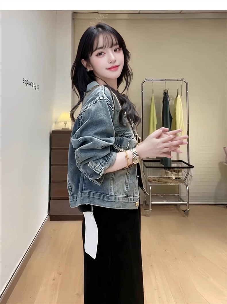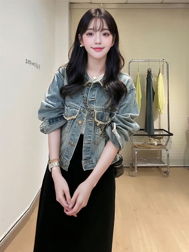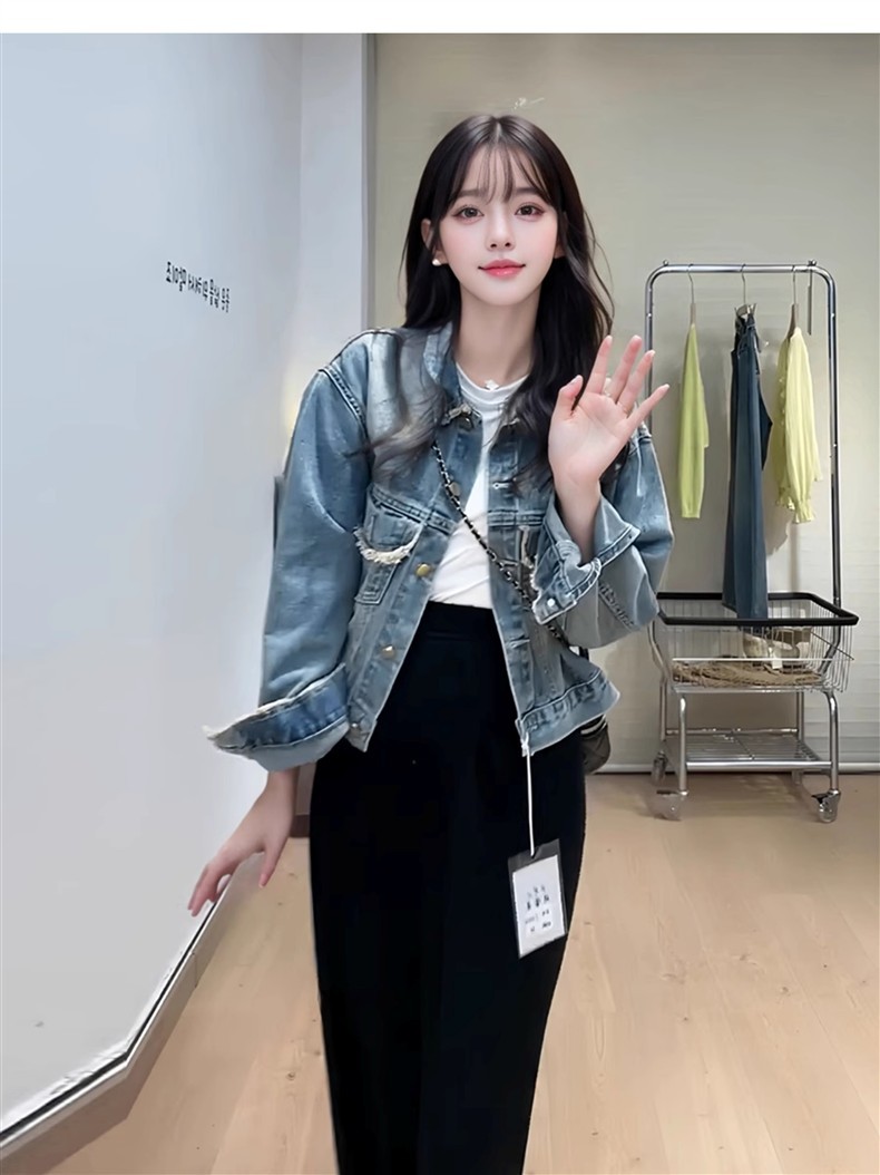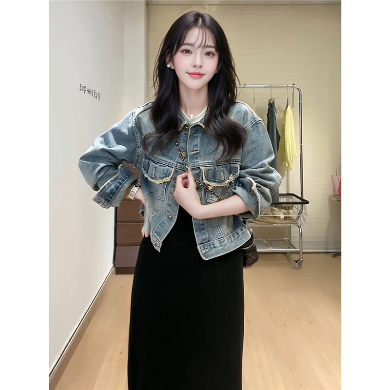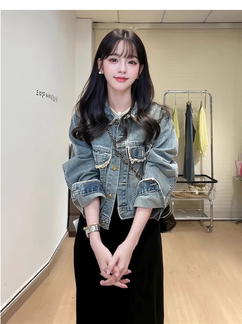 Джинсовая куртка с необработанными краями для женщин весной и осенью. Горячий стиль интернет-знаменитостей в американском ретро, свободная куртка с длинными рукавами и лацканами, шикарный топ.