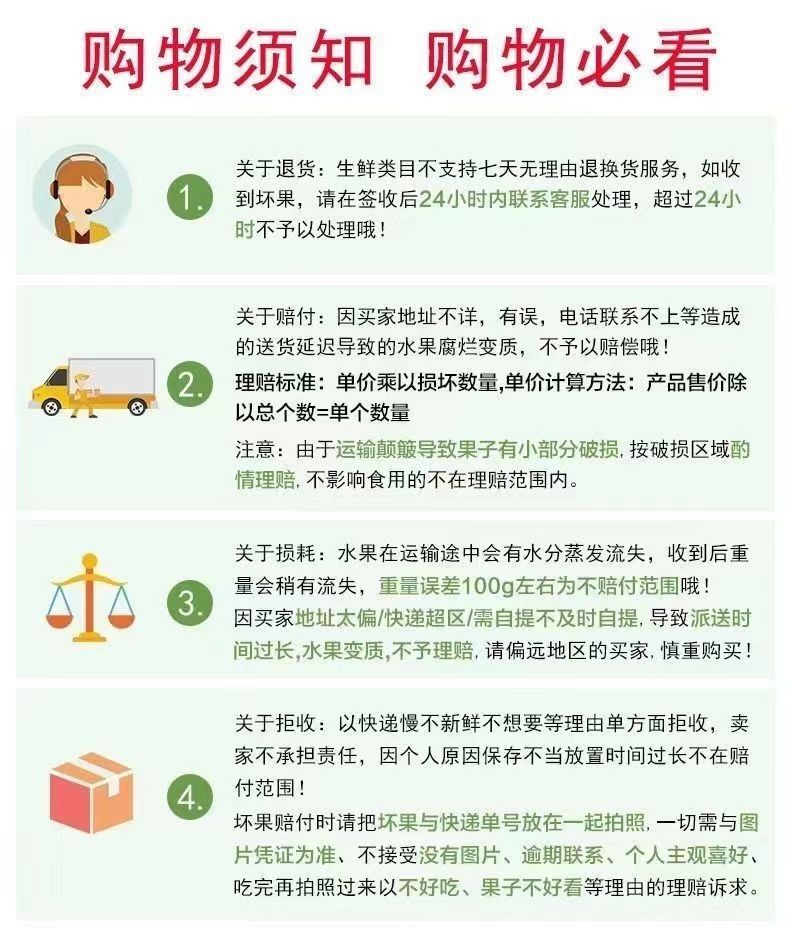 3.生鲜水果一经发货不支持退换、改地址、不支持拒收;坏果、少量比例补差价,收到有问题24小时内联系客服处理赔偿,超过24小时不售后哦!口感和延迟收货不在售后范围内,介意者慎拍!