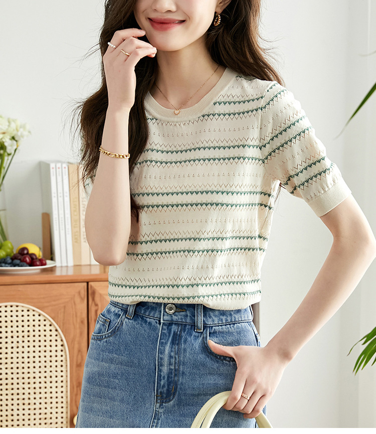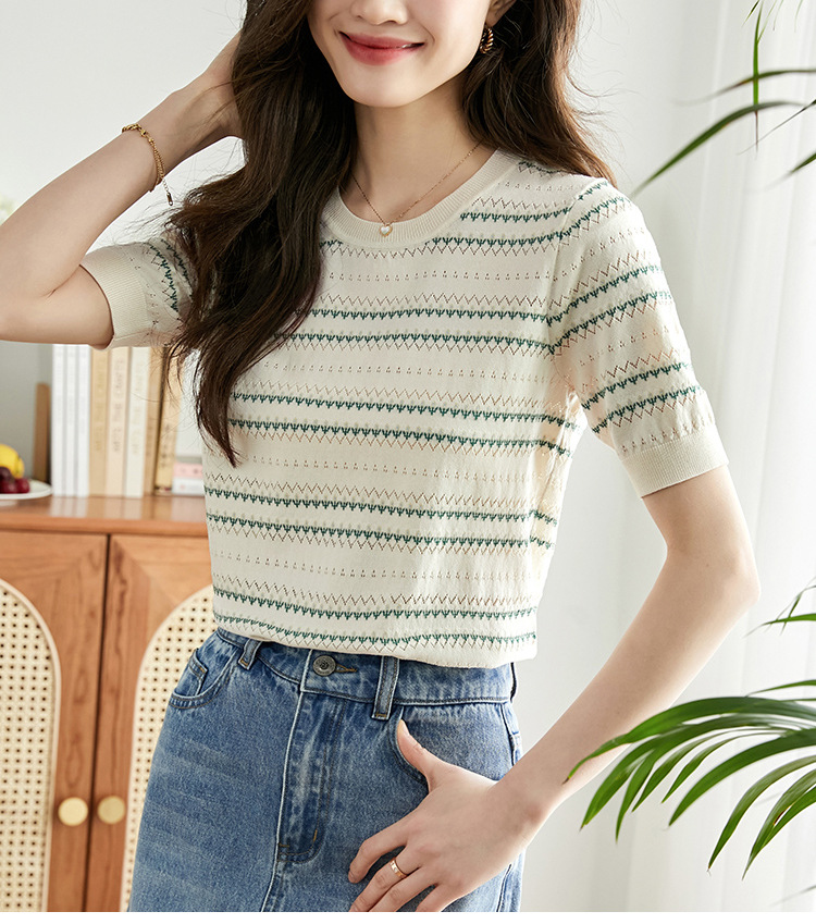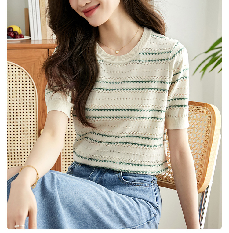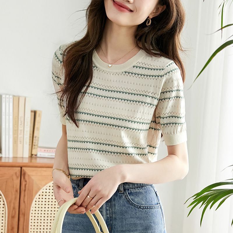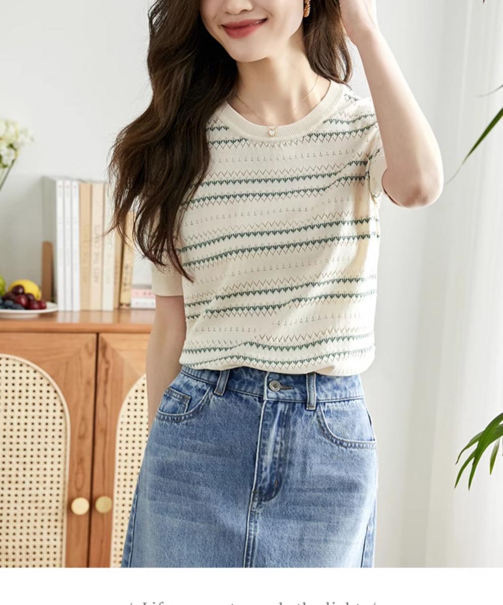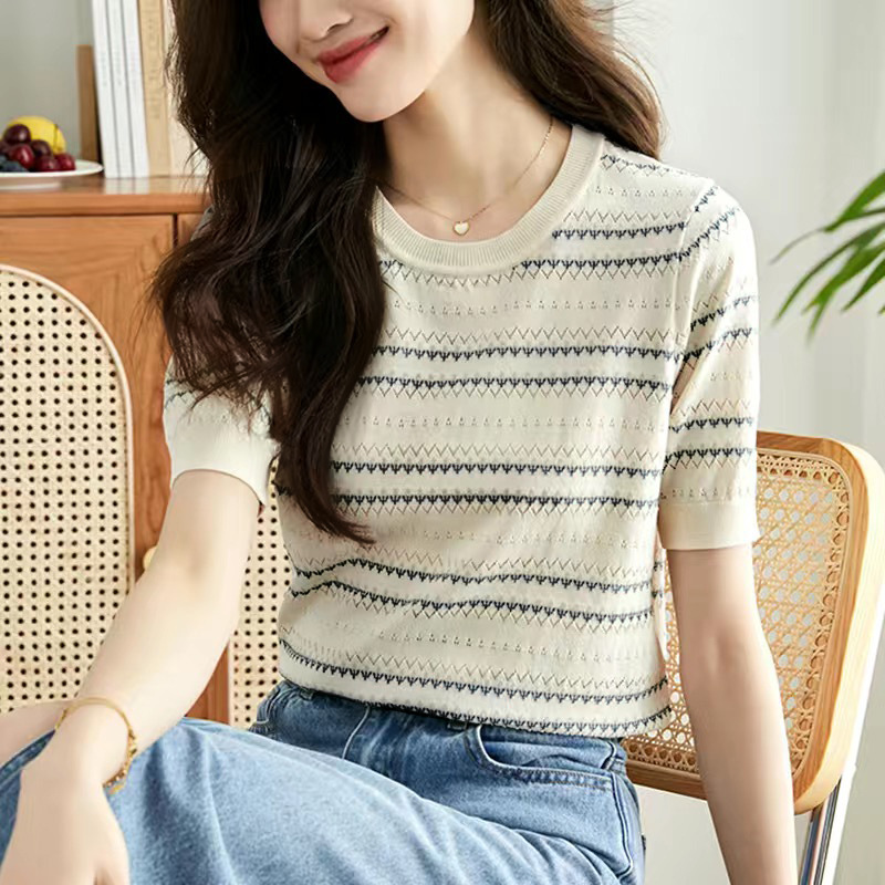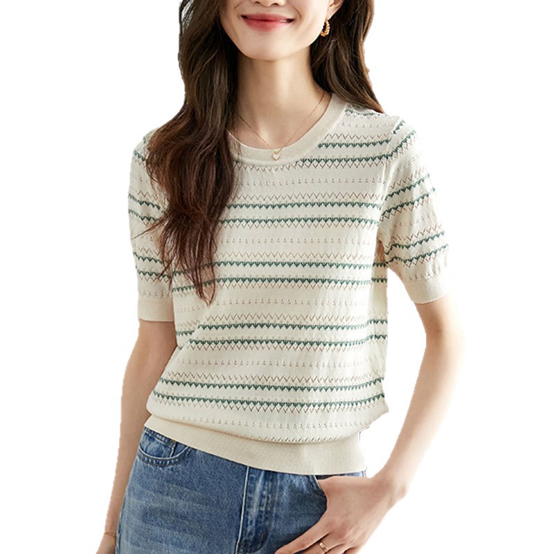 Универсальный топ для кормления в полоску, трикотаж из ледяного шелка, летний тонкий стиль, миниатюрный круглый вырез, жаккардовая перфорированная рубашка для кормления.