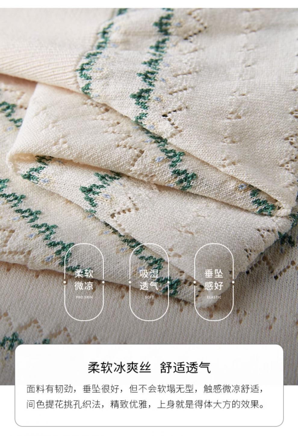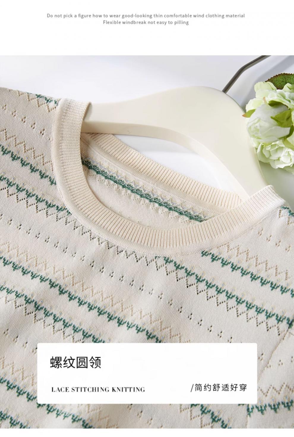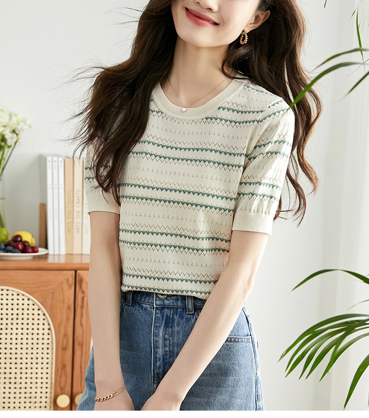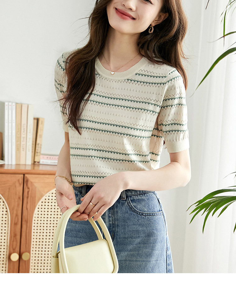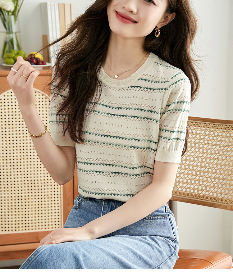 Универсальный топ для кормления в полоску, трикотаж из ледяного шелка, летний тонкий стиль, миниатюрный круглый вырез, жаккардовая перфорированная рубашка для кормления.
