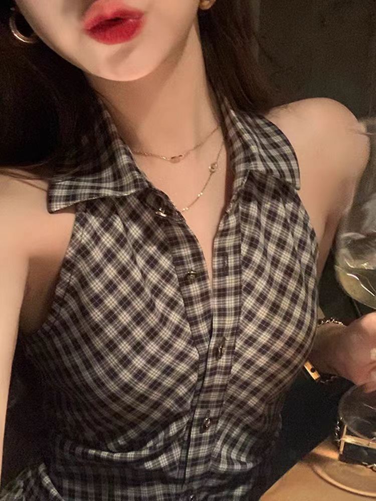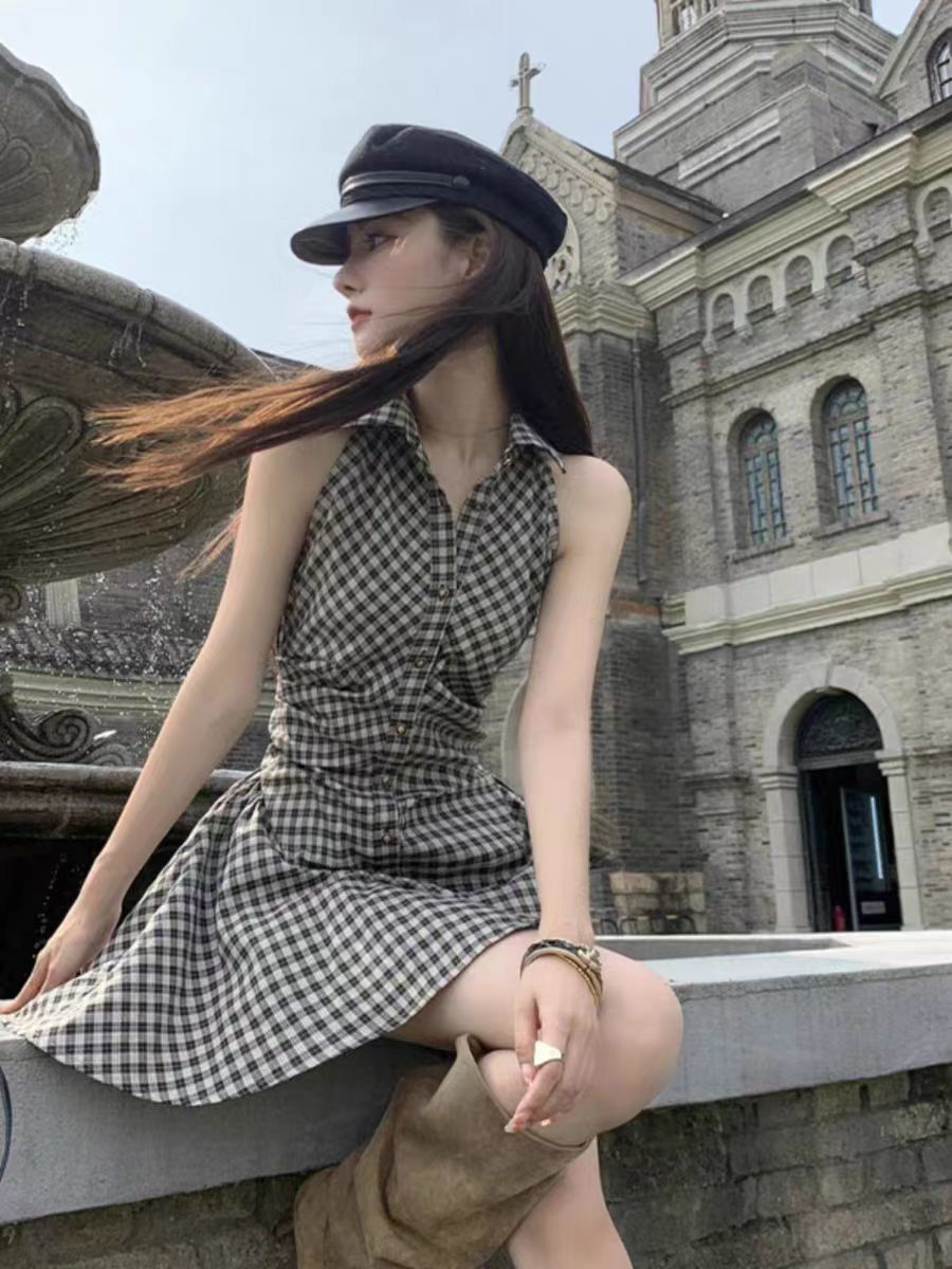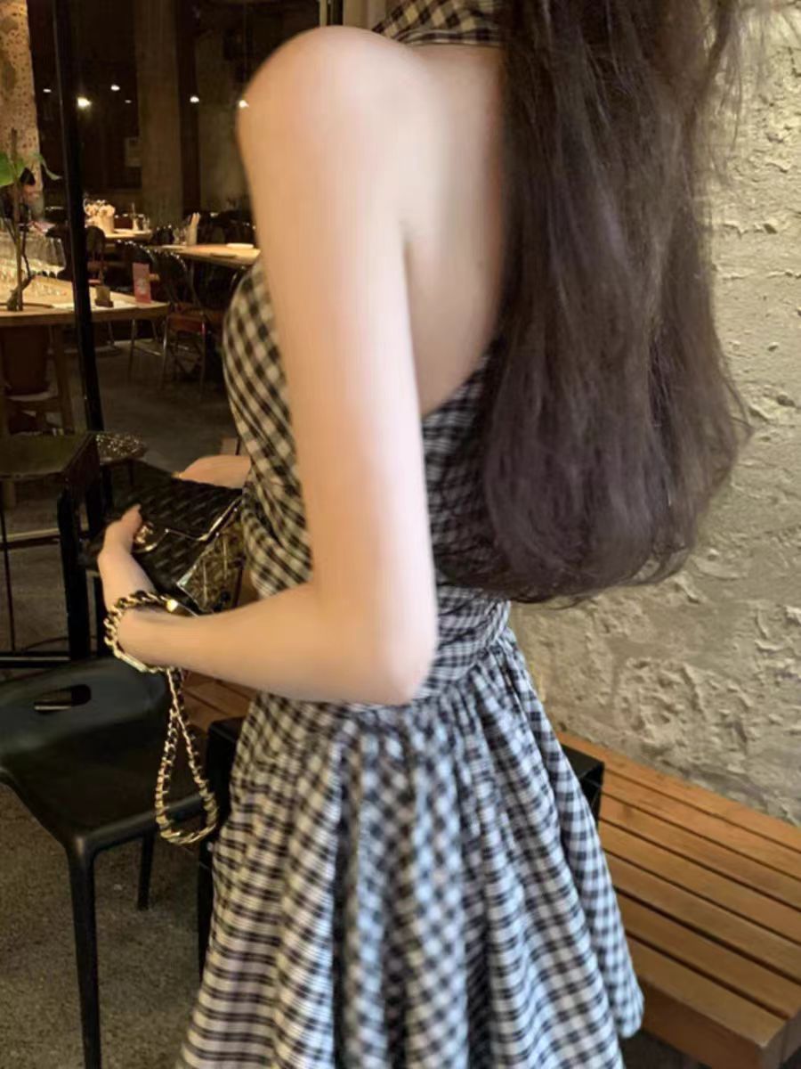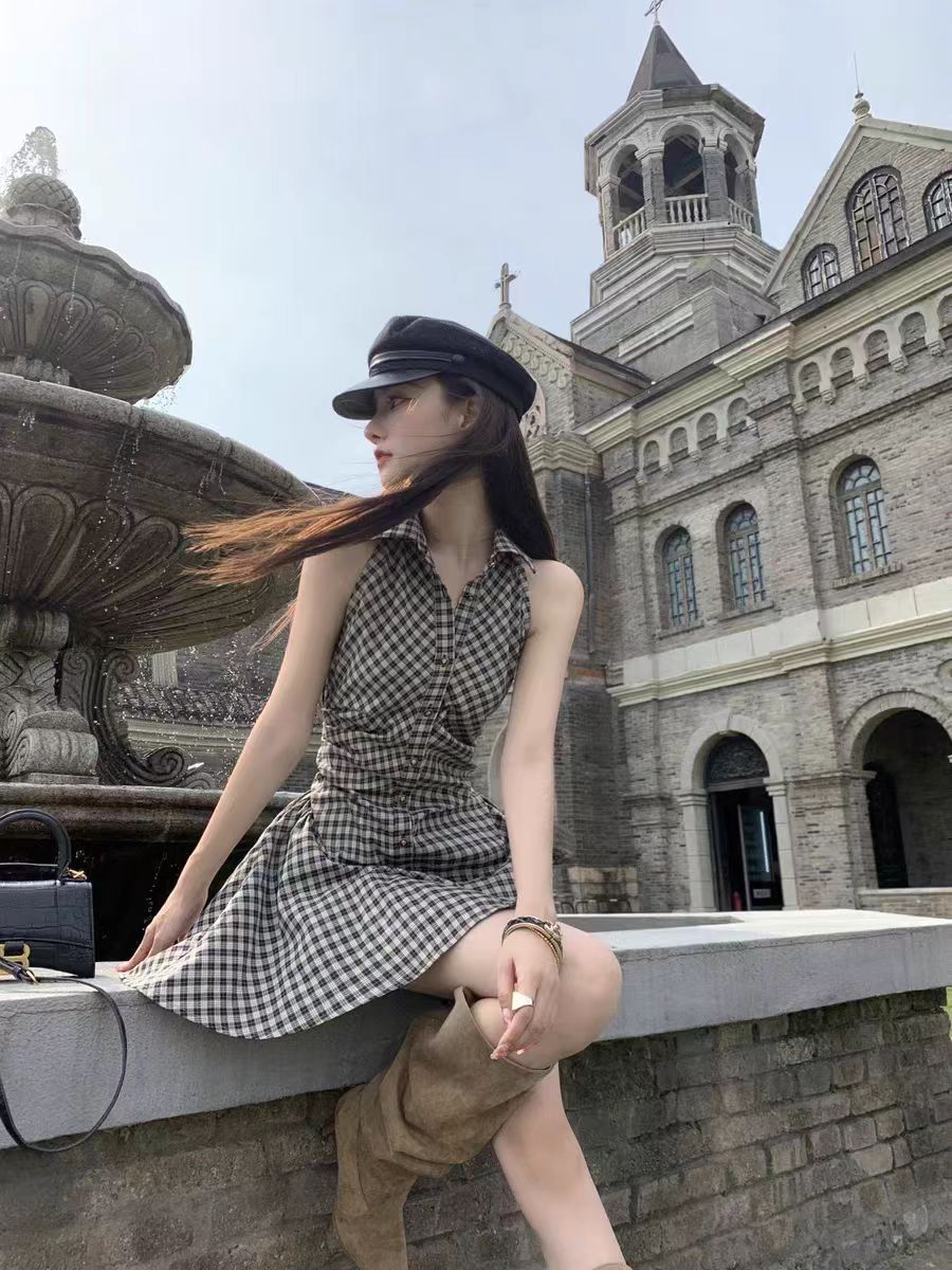 Милое и классное клетчатое платье для женщин летом, чистая горячая девушка, миниатюрная рубашка без рукавов с облегающей талией, плиссированная юбка