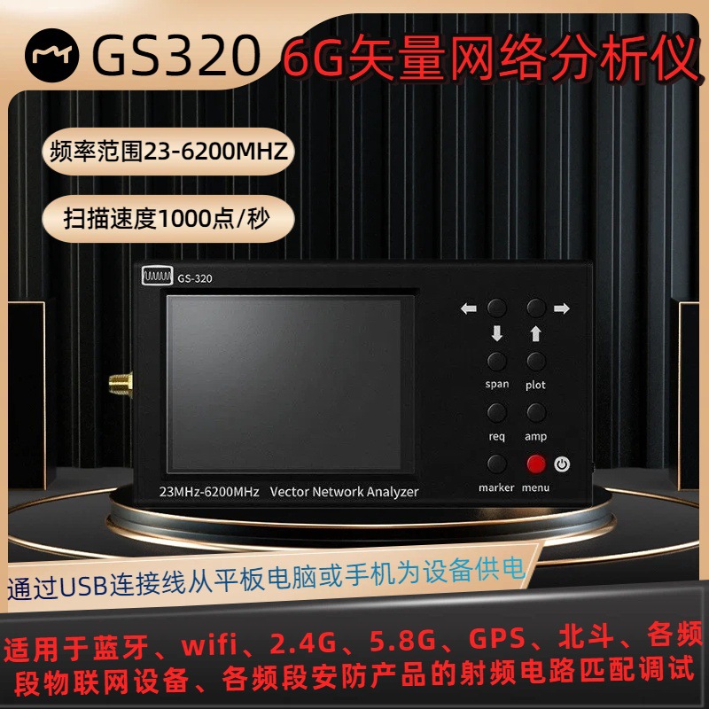 GS-320手持式矢量网络分析仪VNA(反射计) 23-6200 MHz旨在测量无源和有源无线电设备(天线,电缆,滤波器,衰减器,放大器等)的匹配特性。