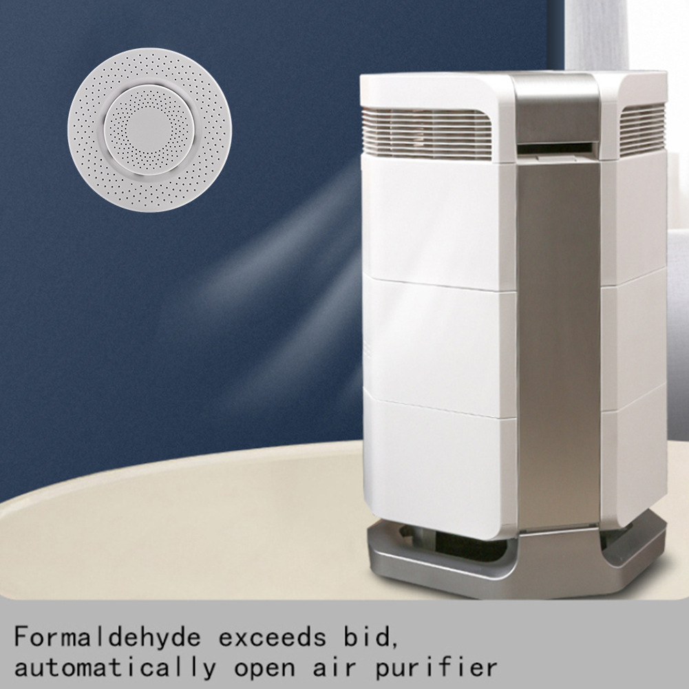 与APP配对后,可以与各种智能家居产品链接。例如,当检测到过量甲醛/VOC时,智能空气净化器会自动打开;当超过二氧化碳时,智能新风机会自动打开;当温度异常时,自动调节空调温度;当湿度过低或过高时,智能加湿器会自动打开/关闭;当检测到某个参数超过标准时,会向报警器发送消息(上述智能联动功能需要与智能家居产品相匹配)