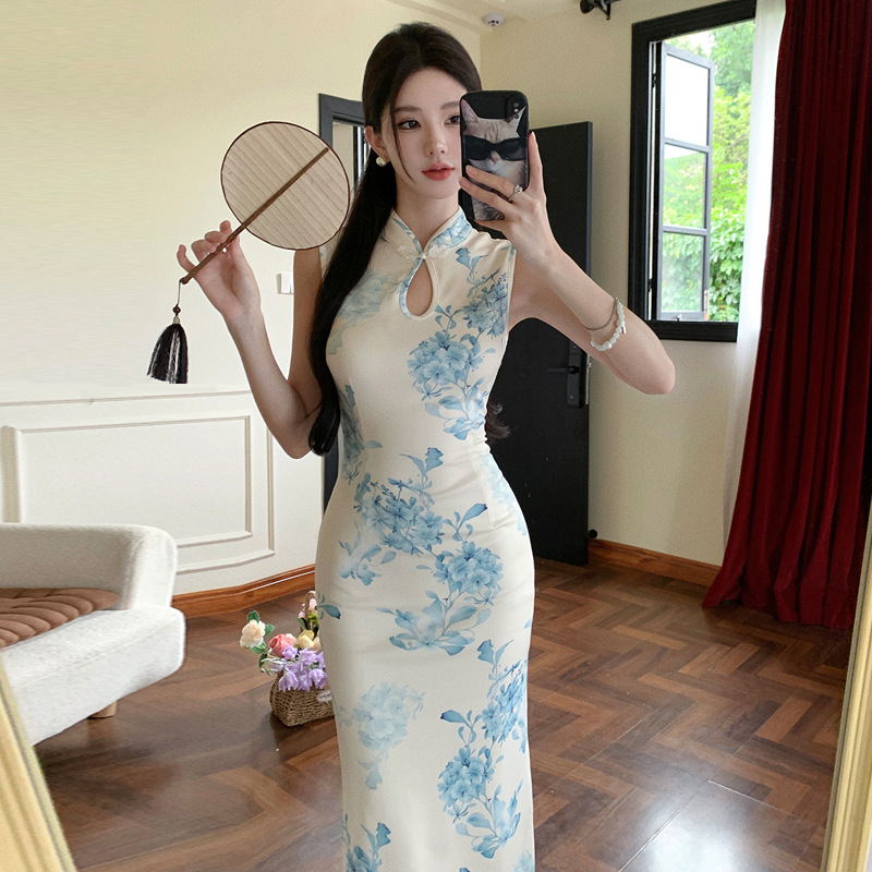 Новое ретро-платье в китайском стиле с принтом в китайском стиле, улучшенное платье Cheongsam, элегантное элегантное облегающее платье с разрезом на бедрах