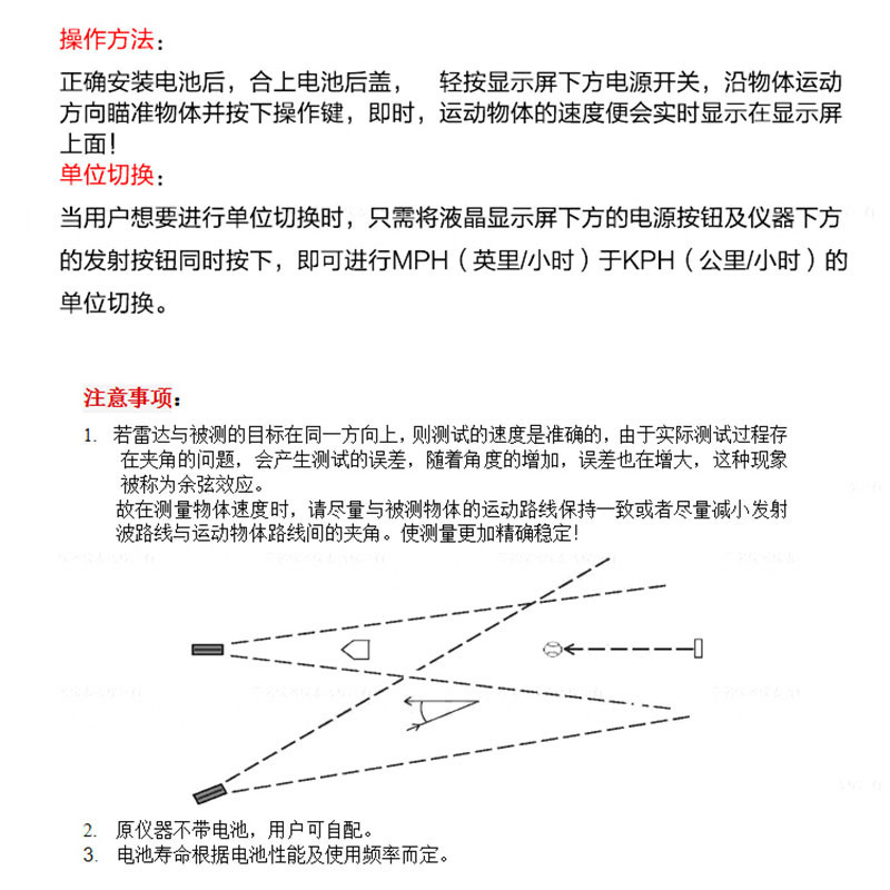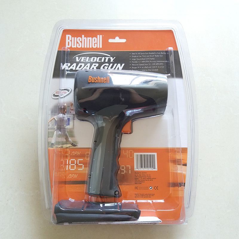 BUSHNELL雷达测速仪,它的测速精度是:+/-2 KPH(公里/小时);+/-1 MPH(英里/小时)。雷达测速仪的使用很简单,正确安装电池后,轻按显示屏下方电源开关,沿物体运动方向瞄准物体并按下操作键,即时,运动物体的速度便会实时显示在显示屏上面!