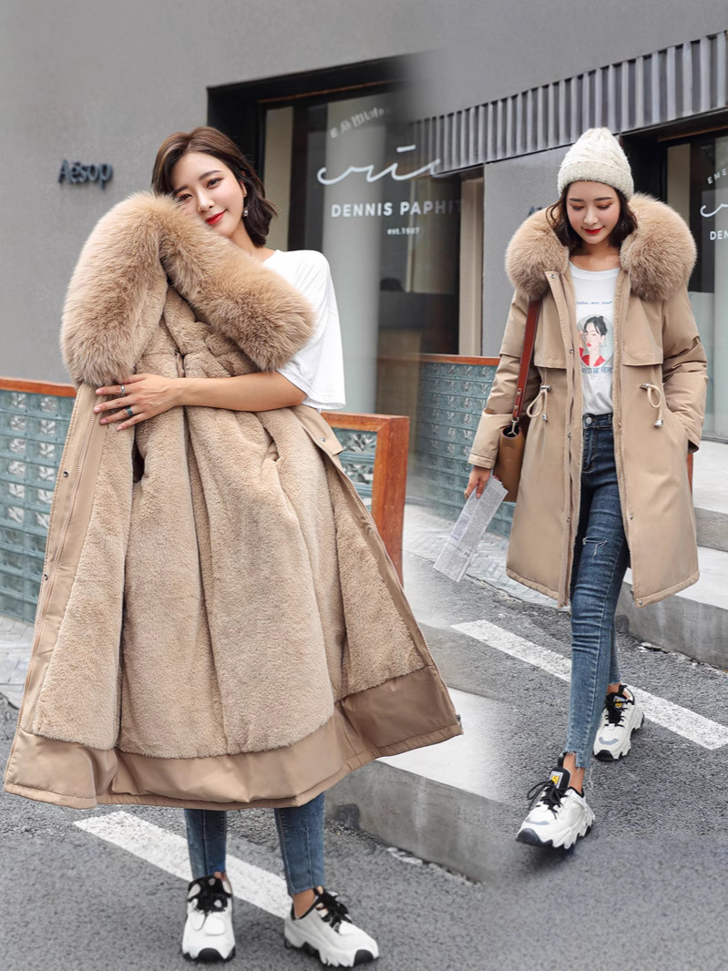 Зимняя куртка 2025 года, европейский и американский стиль, женская, средней длины, с большим меховым воротником, на флисовой подкладке, утепленная, пуховая, с хлопковой подкладкой.