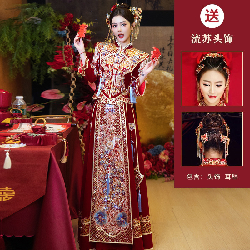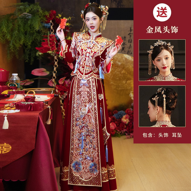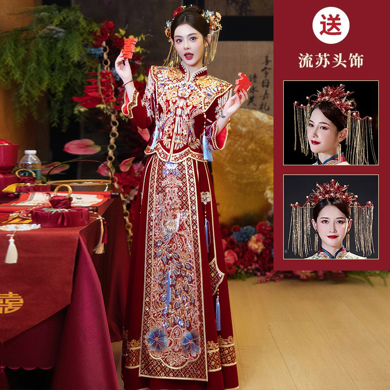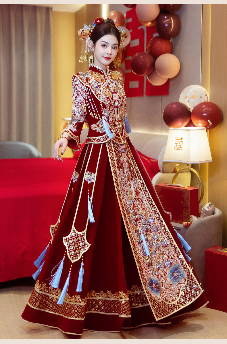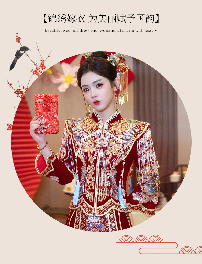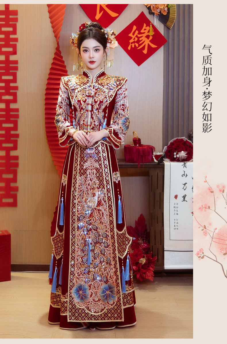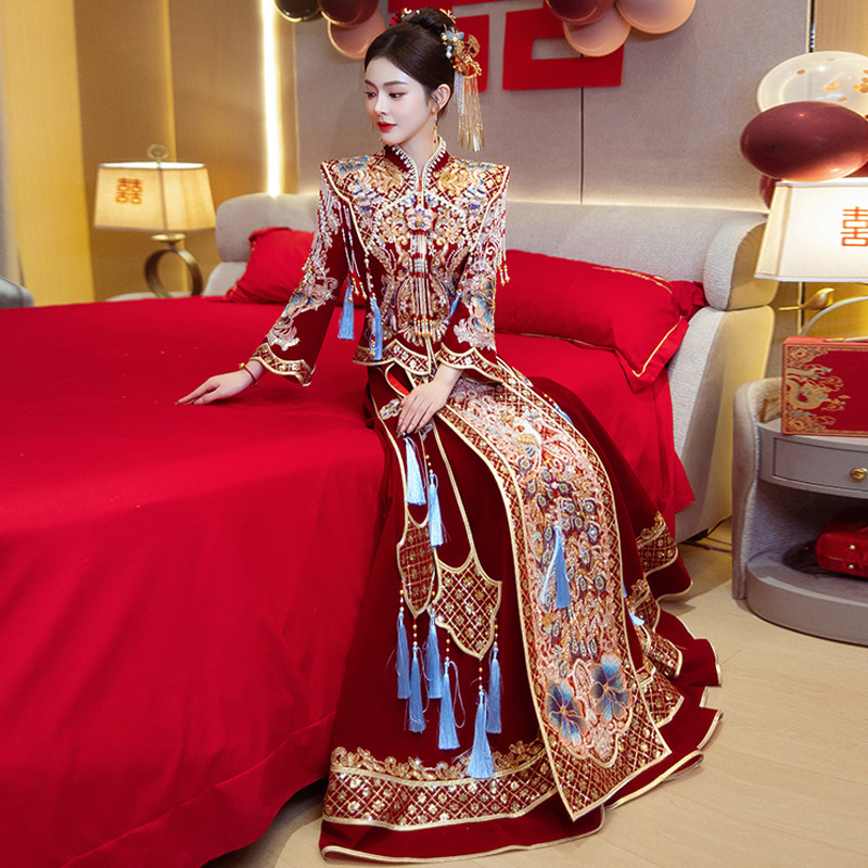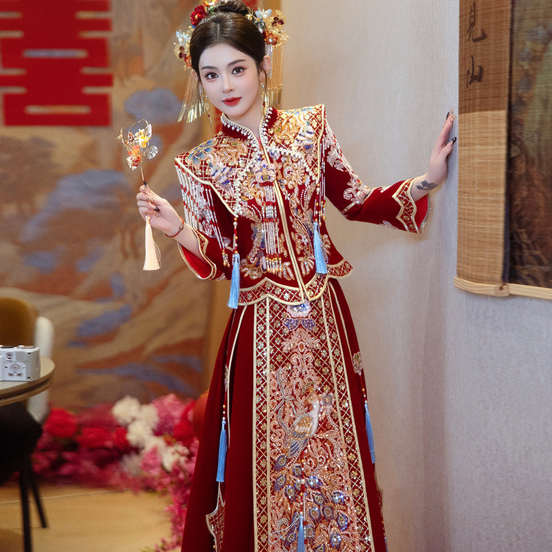 Новое свадебное платье в китайском стиле с элитным ощущением, элегантный костюм Xiuhe с воротником-стойкой, длинными рукавами и бархатным платьем для женщин.