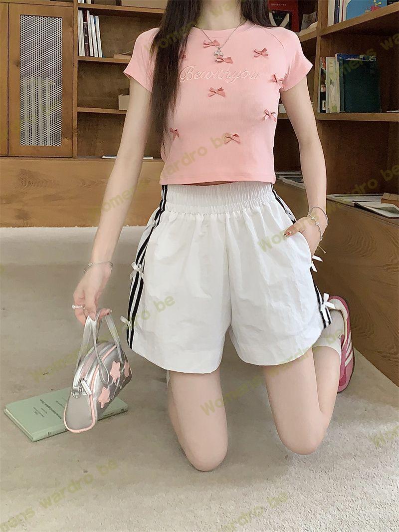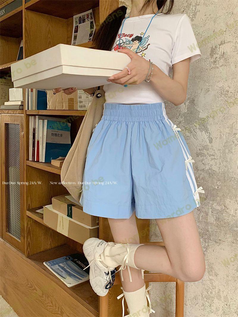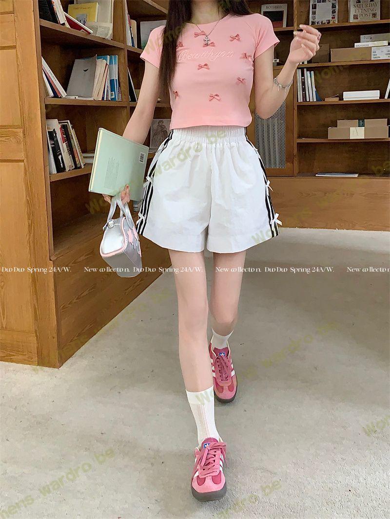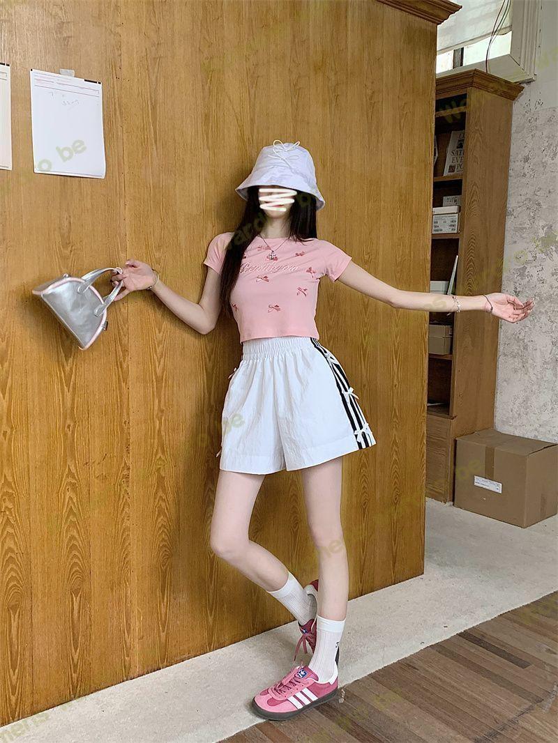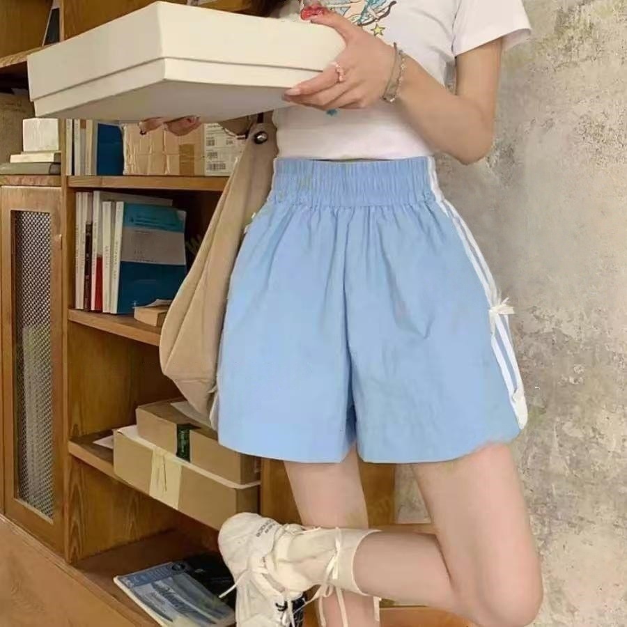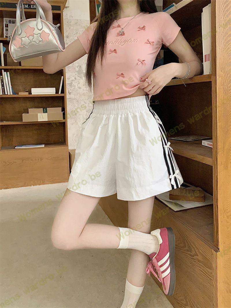 Женские летние шорты для уличной одежды, спортивные повседневные шорты в тонкую полоску с бантом для горячих девушек, модные утягивающие шорты прямого кроя.