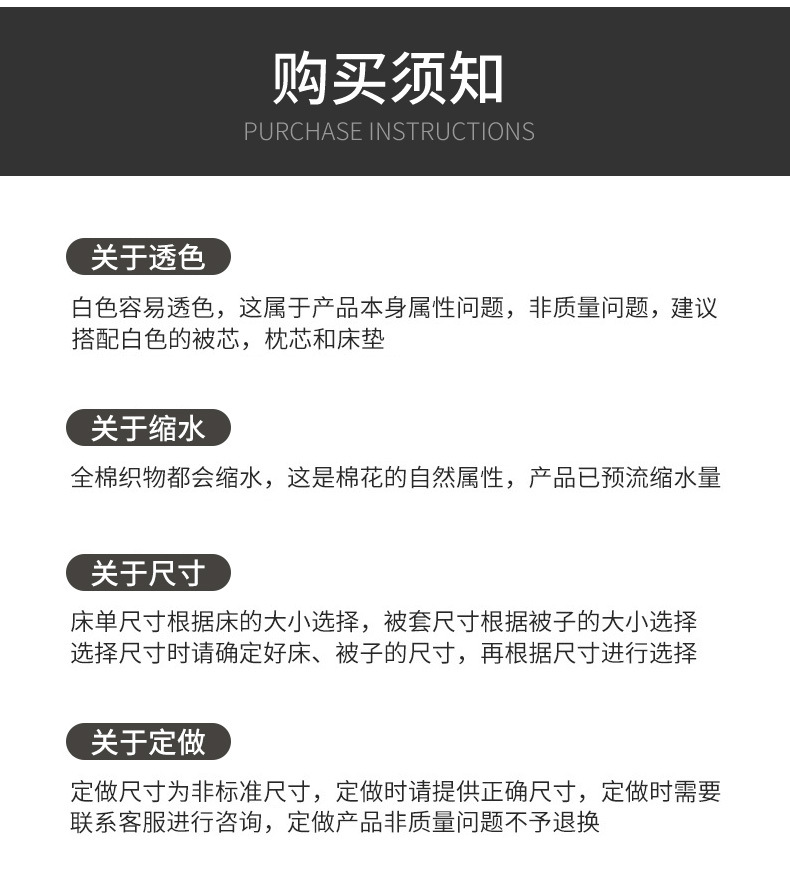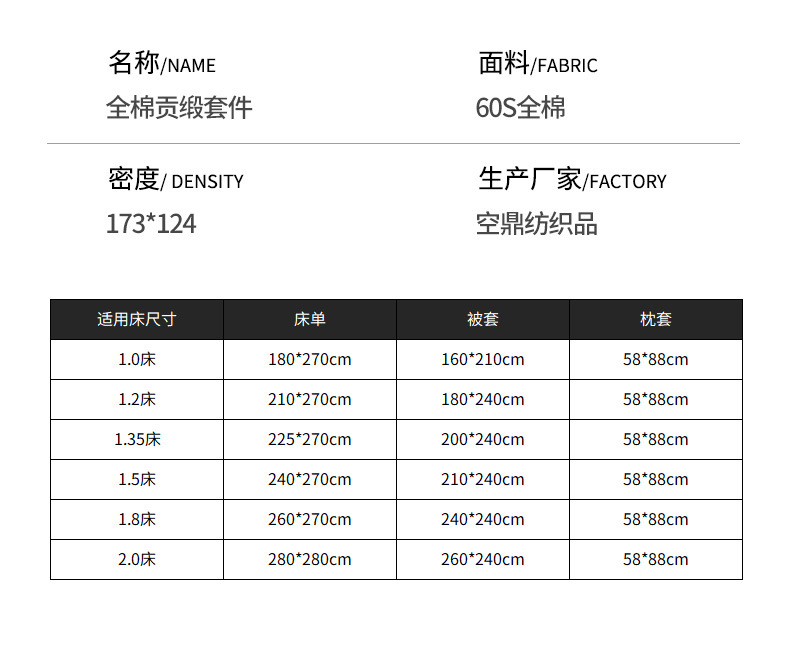 1m комплект постельного белья из трех предметов (только простыни 160*210, наволочки 180*280, 58*88*1); 1.2m комплект постельного белья из трех предметов (только пододеяльник 180*240, простыни 205*280, наволочка 58*88*1); 1.5m комплект постельного белья из четырех предметов (пододеяльник 210*240, простыни 240*280, наволочки 58*88*2 шт.); 2.0m комплект постельного белья из четырех предметов (пододеяльник 255*240, простыни 280*280, наволочки 58*88*2 шт.)