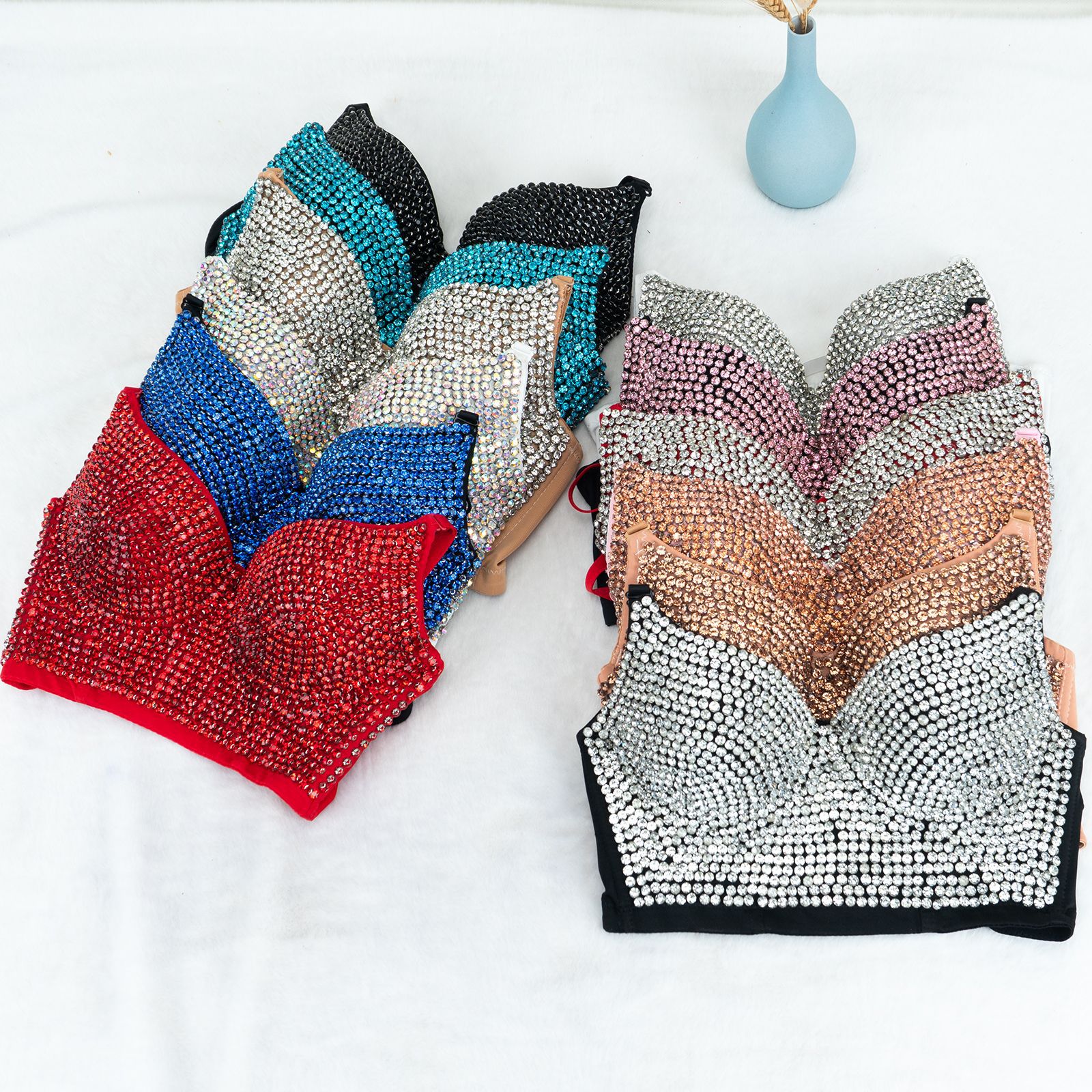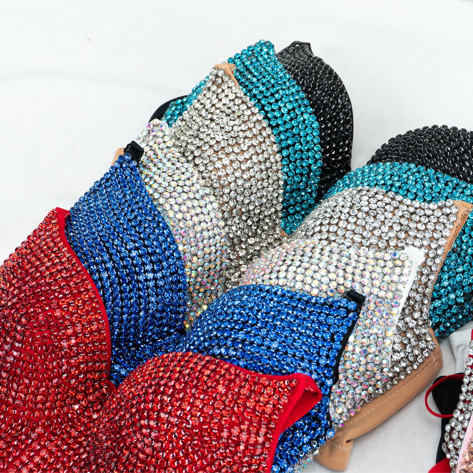 Черное дно + черный бриллиант; Белый фон + цветные бриллианты; Черный низ + розовый бриллиант; Черный фон + голубой ромб; Черный низ + темно-синий; Цвет кожи базовый + белый бриллиант; Тональный крем + шампань-диамант; Нижняя часть кожи + бриллиант цвета шампанского; Красный бриллиант на красном фоне; Белый фон + белые бриллианты; Фундамент + белый бриллиант; Красный фон + белые бриллианты; Черный фон + белые бриллианты; Черный фон + фиолетовый бриллиант