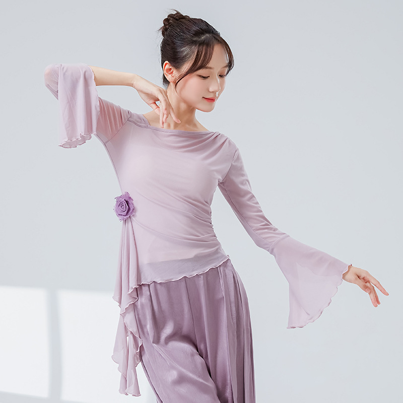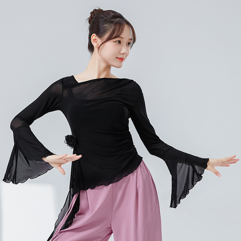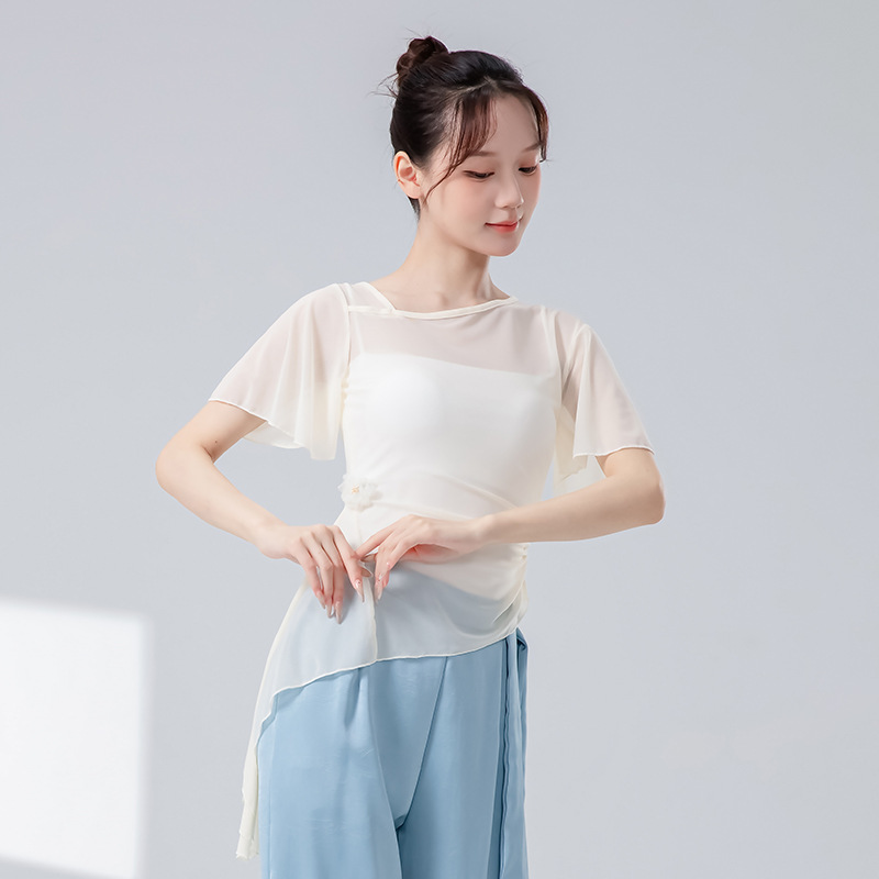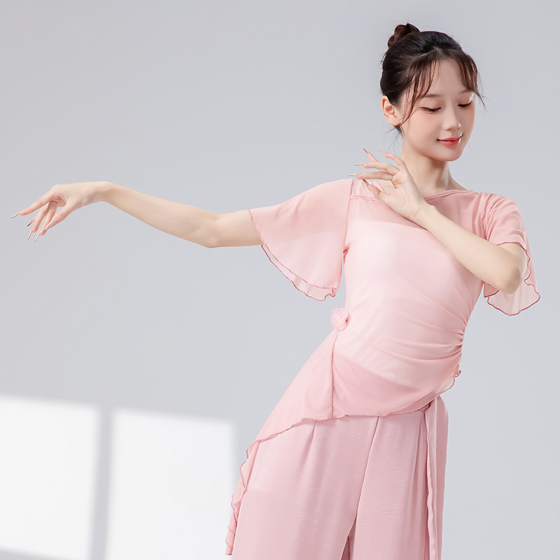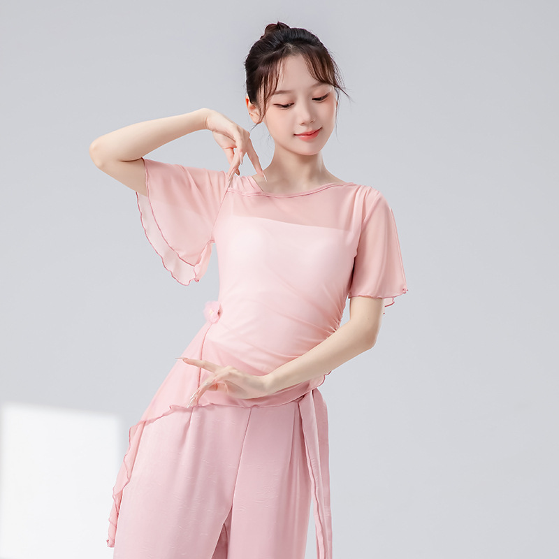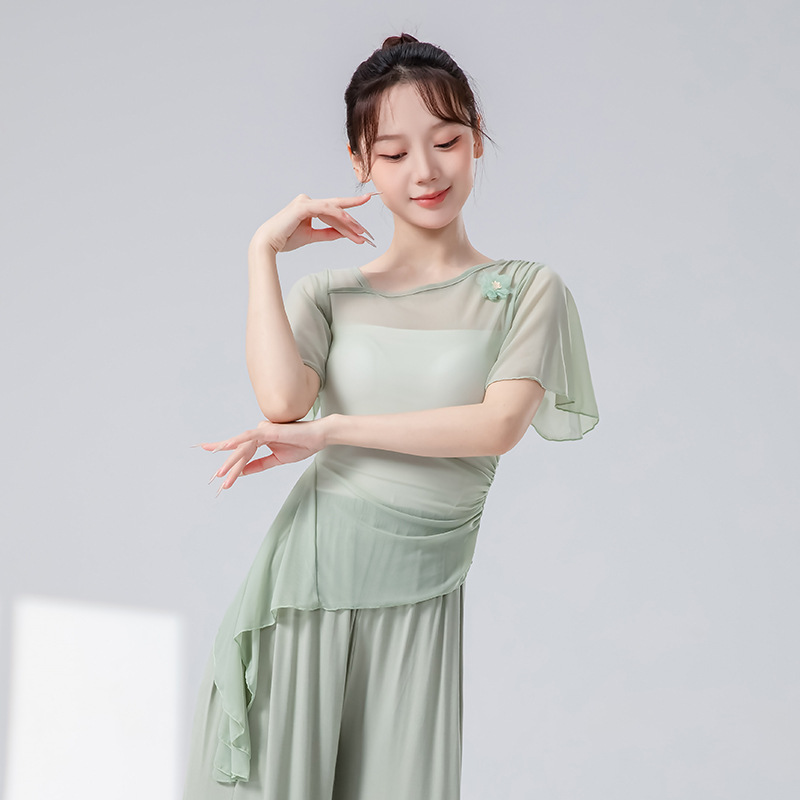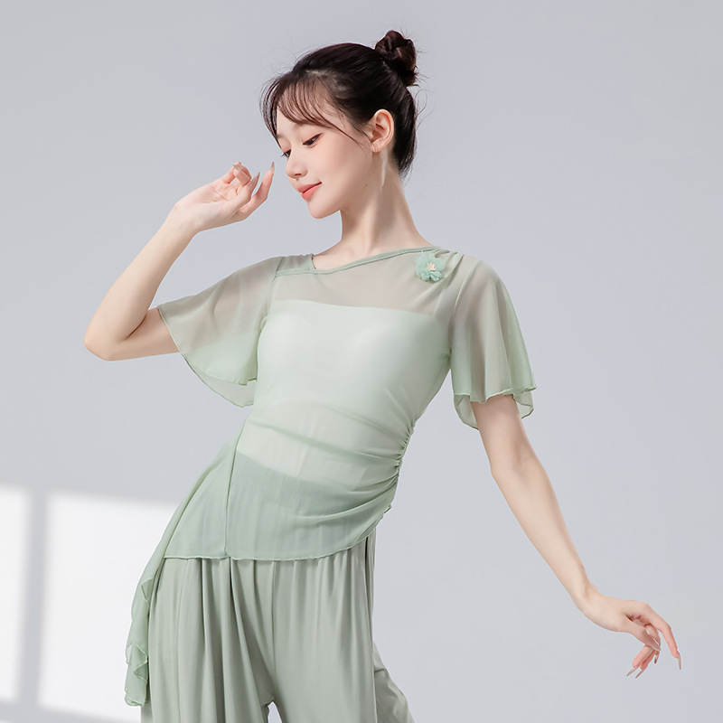 Классическая танцевальная одежда для женщин, новый облегающий топ с короткими рукавами из сетки с цветочным принтом, китайский танцевальный костюм для ежедневных тренировок и выступлений.