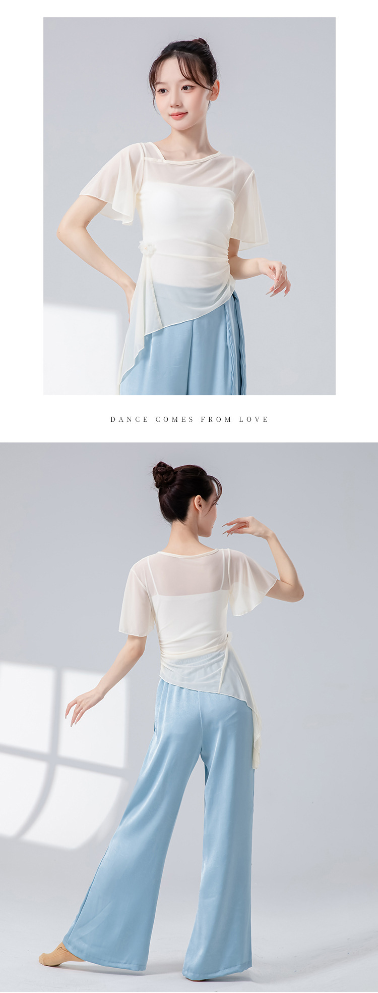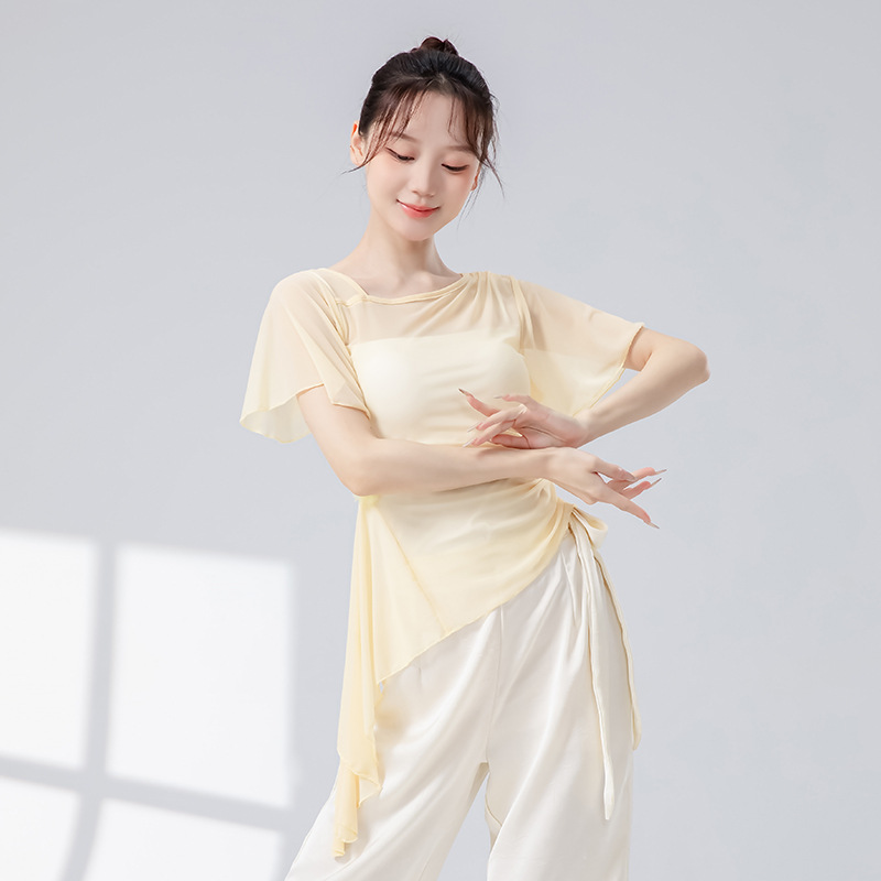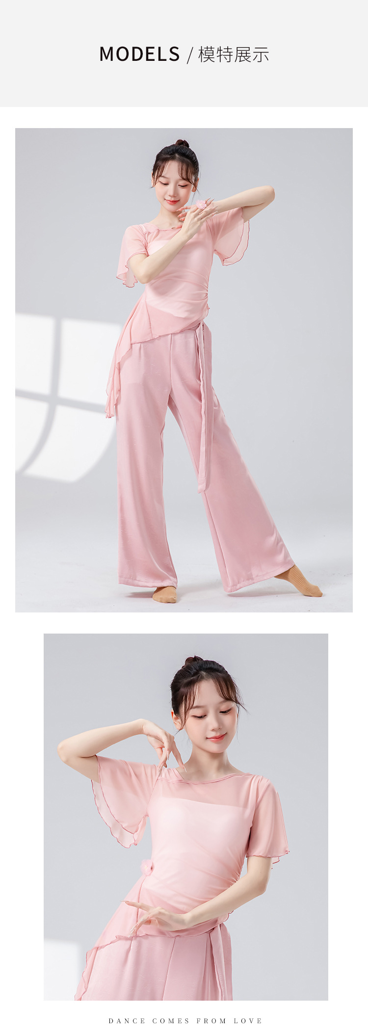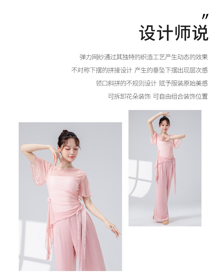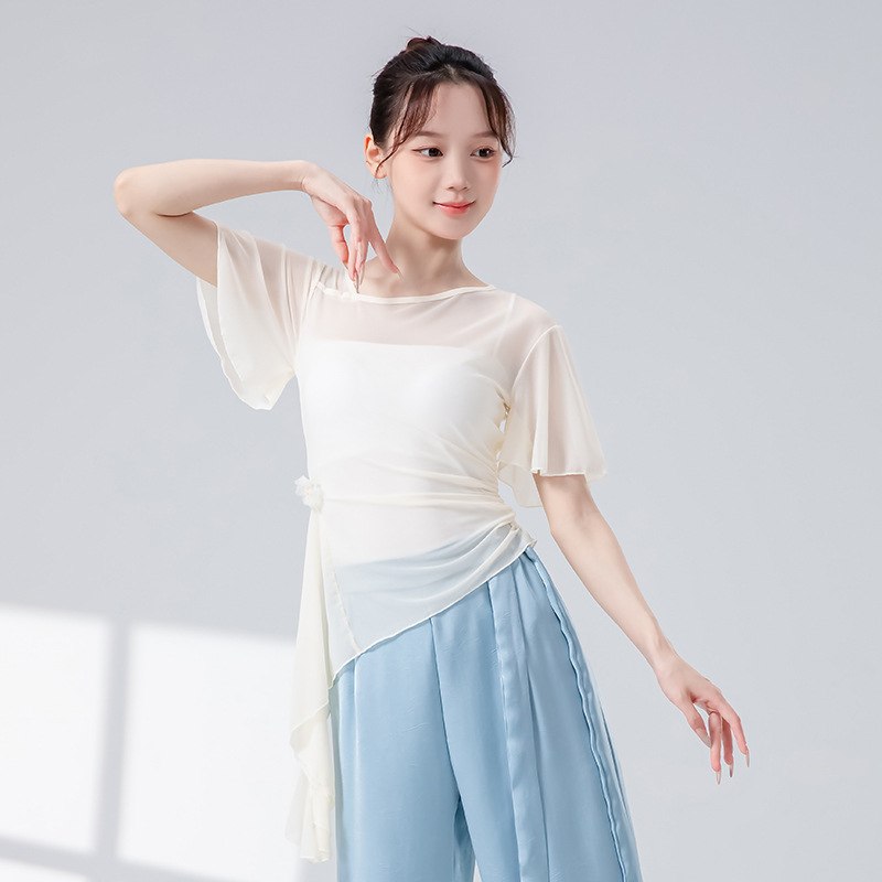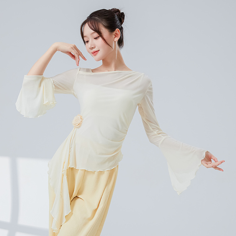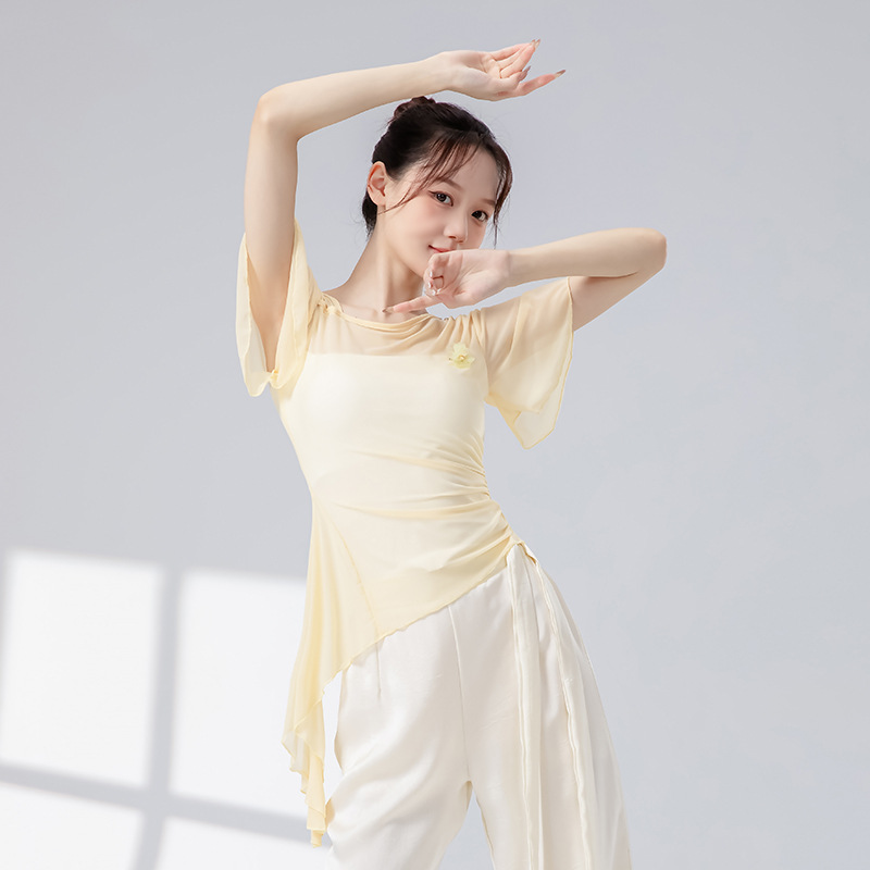 Классическая танцевальная одежда для женщин, новый облегающий топ с короткими рукавами из сетки с цветочным принтом, китайский танцевальный костюм для ежедневных тренировок и выступлений.
