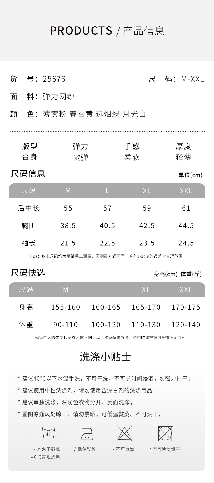 Пудровый туман - короткие рукава; Весенний абрикосовый желтый - короткие рукава; Лунный свет белый - Короткий рукав; Дымчато-зеленый цвет, короткие рукава; Джинью черный с длинными рукавами; Линьюнь Фиолетовый - Длинный Рукав; Сосна чай зеленый-длинные рукава; Лунный свет белый - Длинный рукав; Уважайте оригинальность, пиратство будет преследоваться по закону.