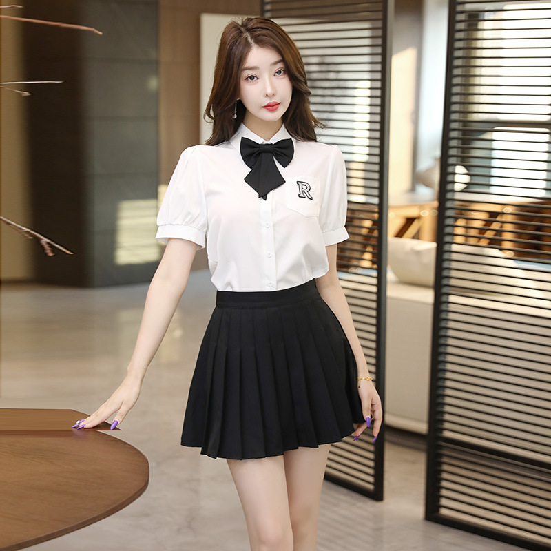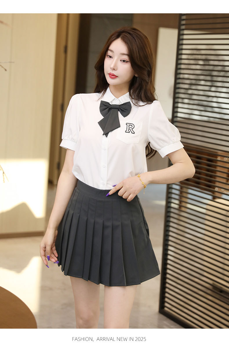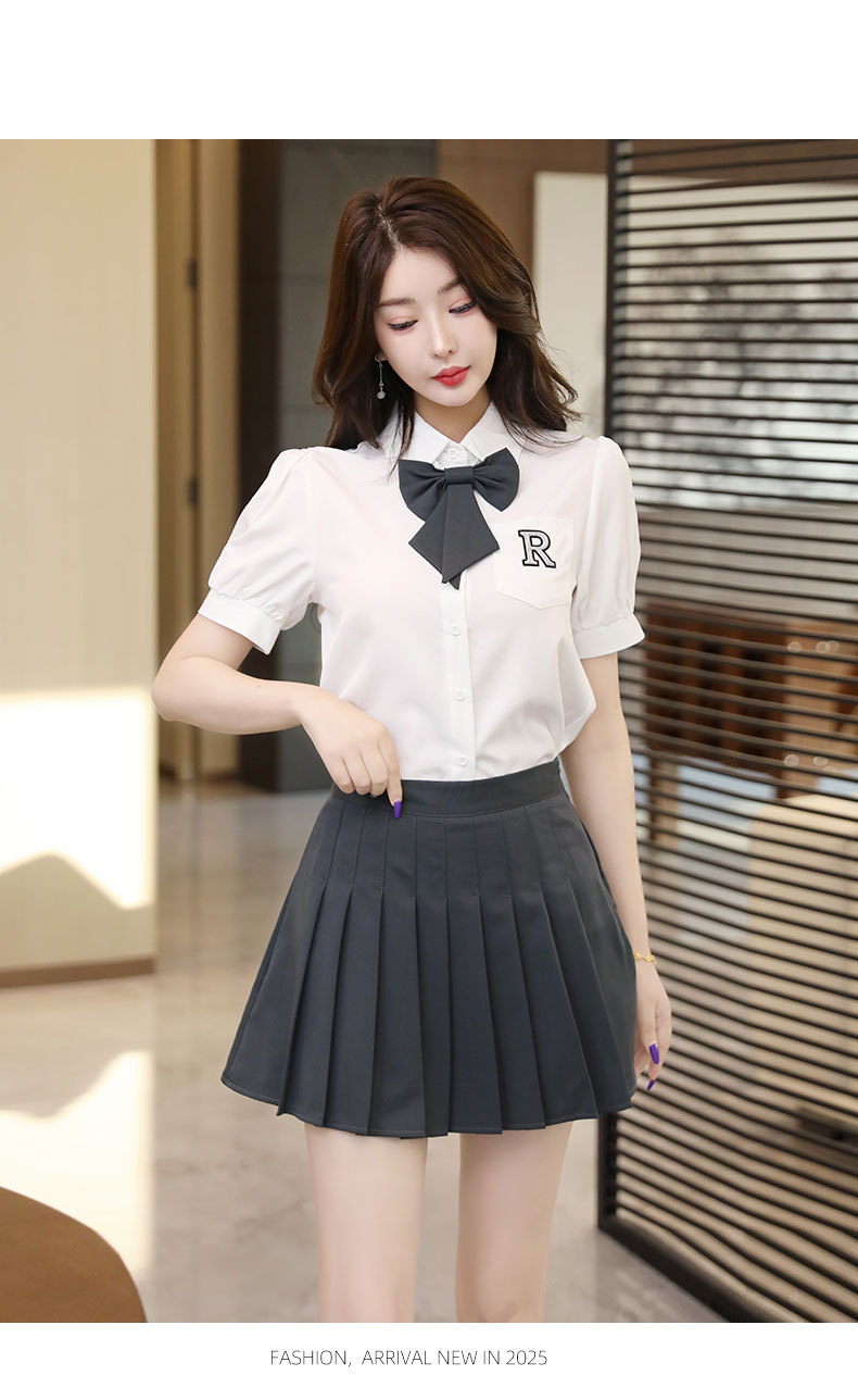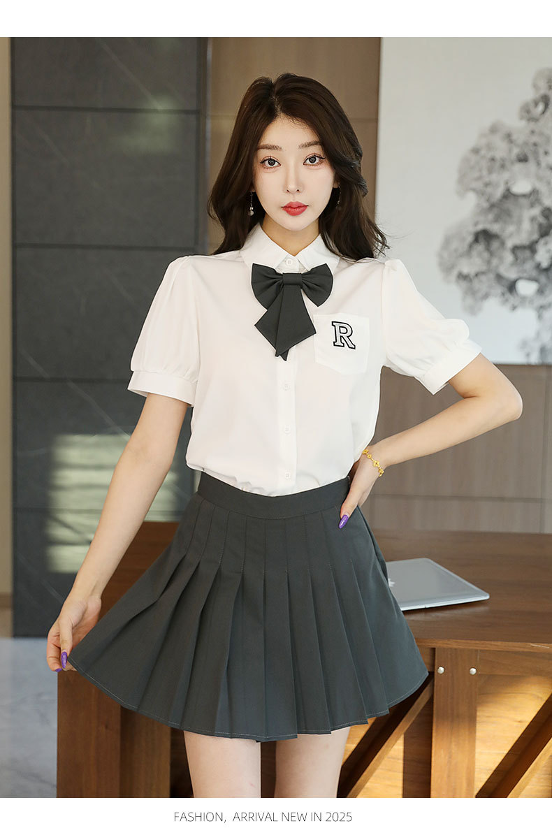 Белый топ/черная юбка; Белый топ/темно-серая юбка; Белый топ (без галстука); темно-серая юбка; черная юбка