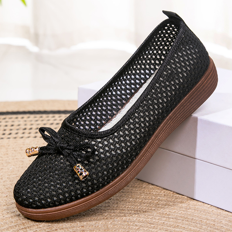 Летние женские туфли нового дизайна из трикотажной ткани, женские туфли в старинном пекинском стиле, удобная обувь для женщин среднего и пожилого возраста, нескользящие туфли с мягкой подошвой и неглубоким вырезом из сетки.