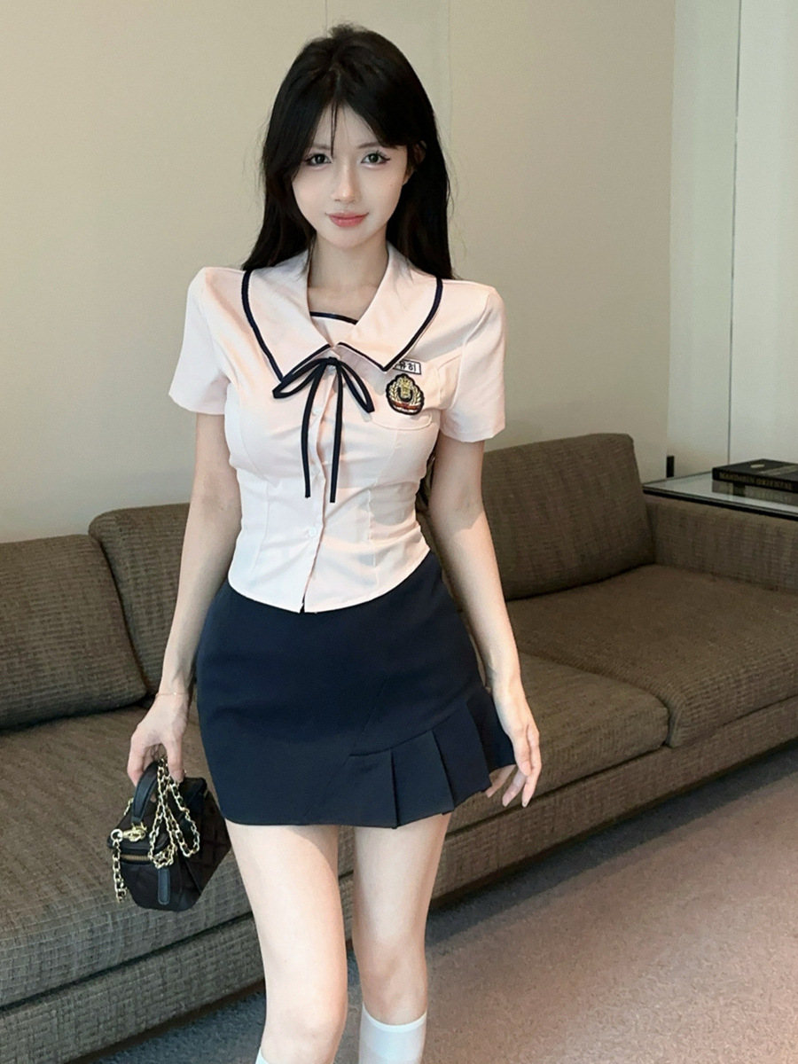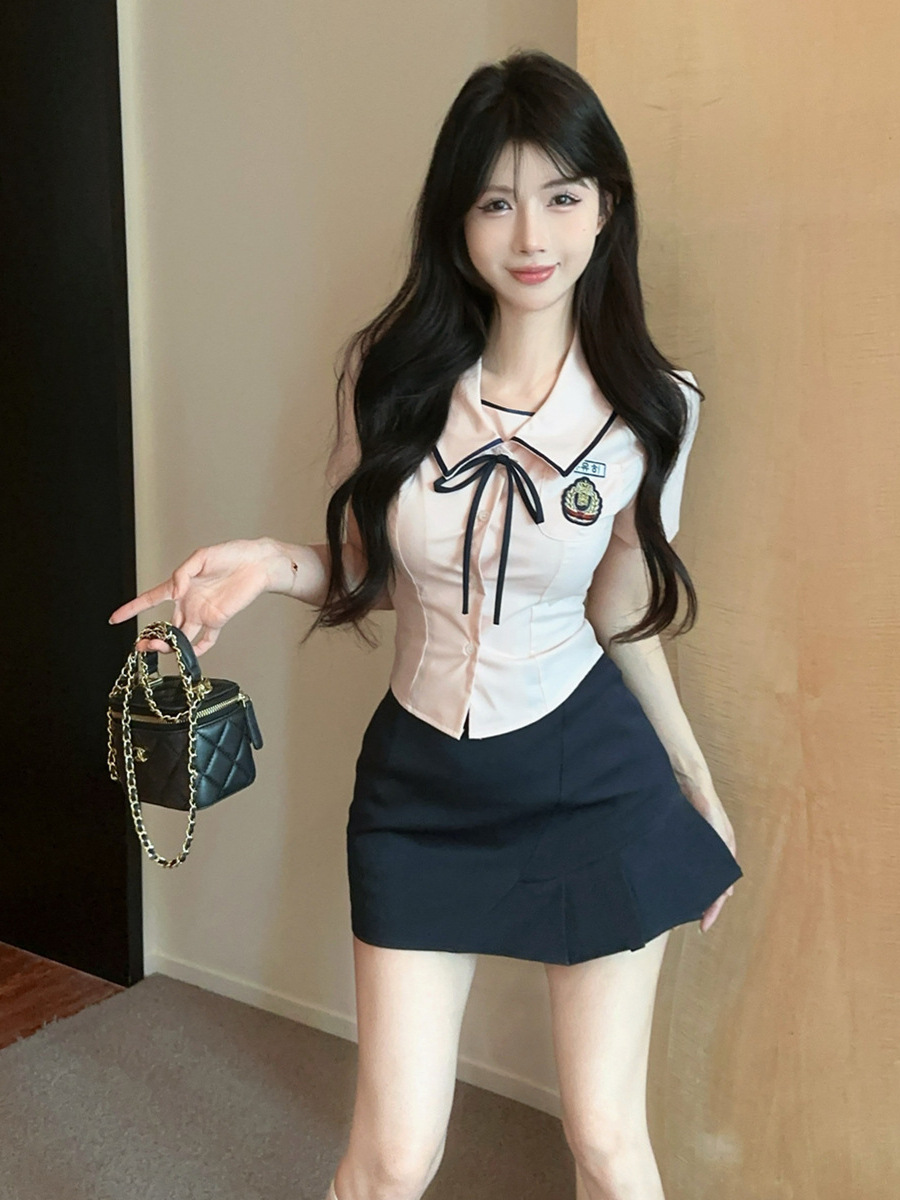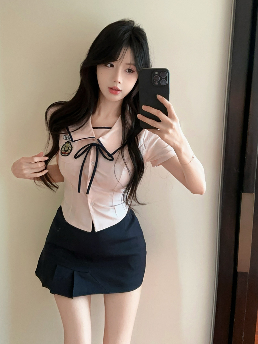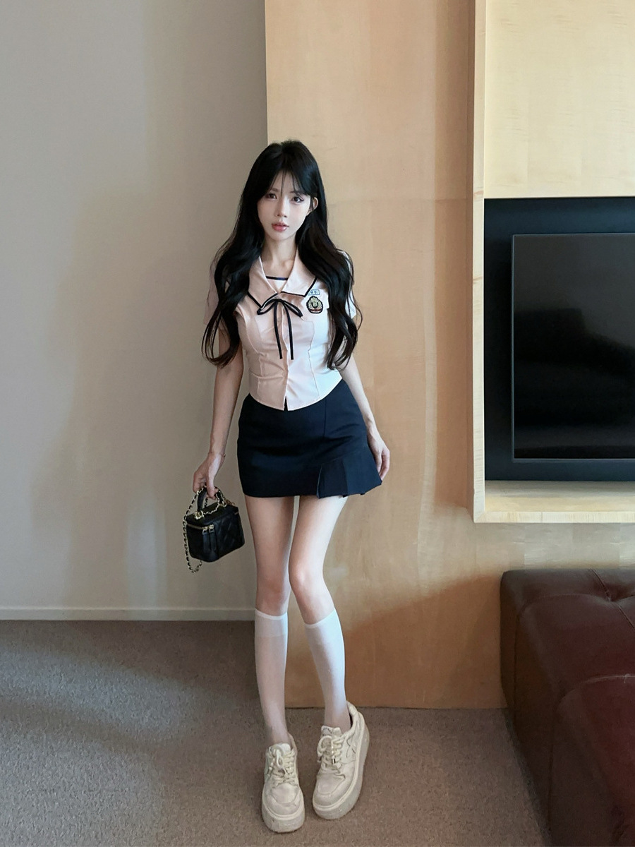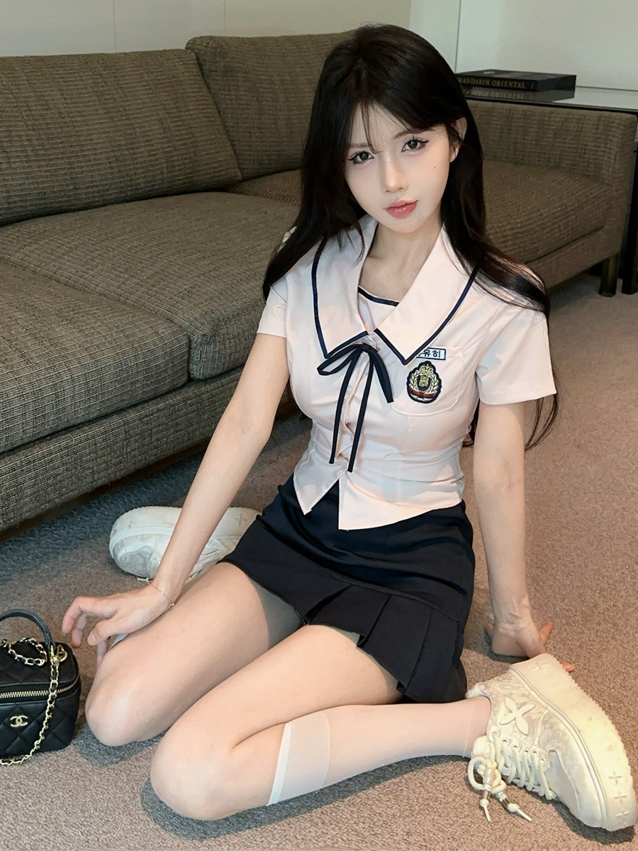 Летний новый корейский костюм в стиле JK, преппи, сладкий, сексуальный, с короткими рукавами, высокой талией и плиссированной юбкой.