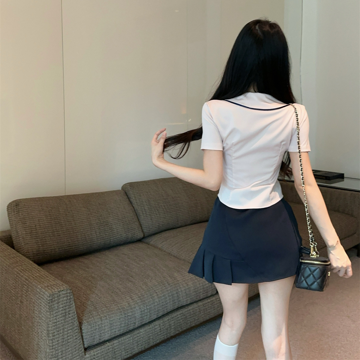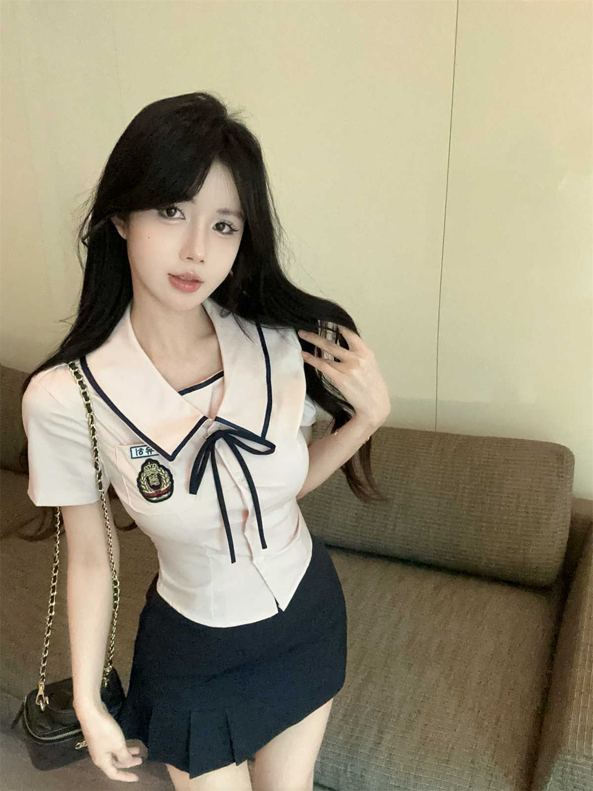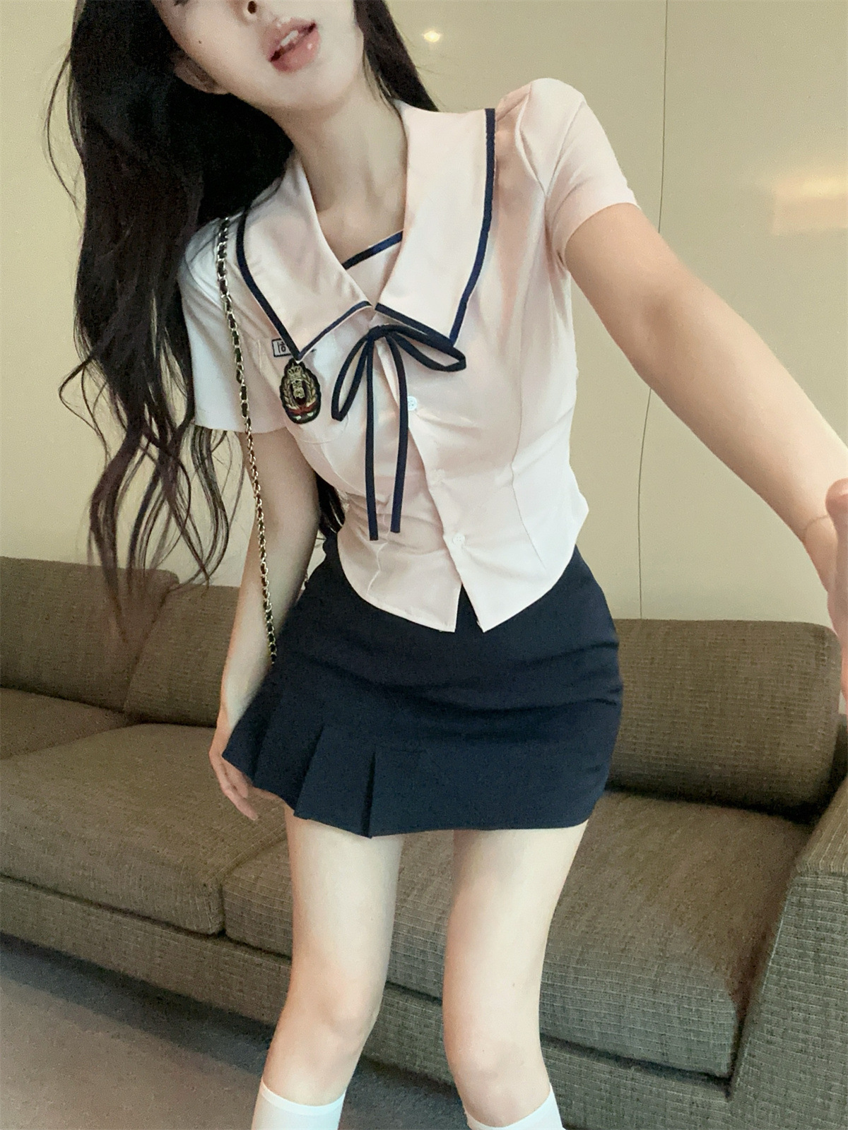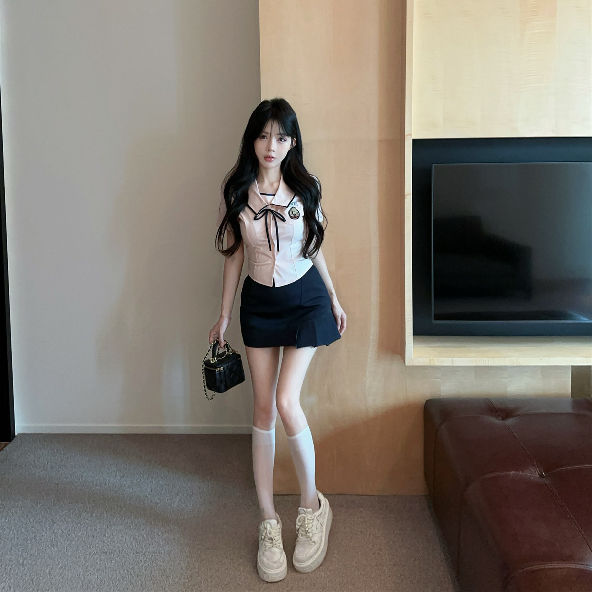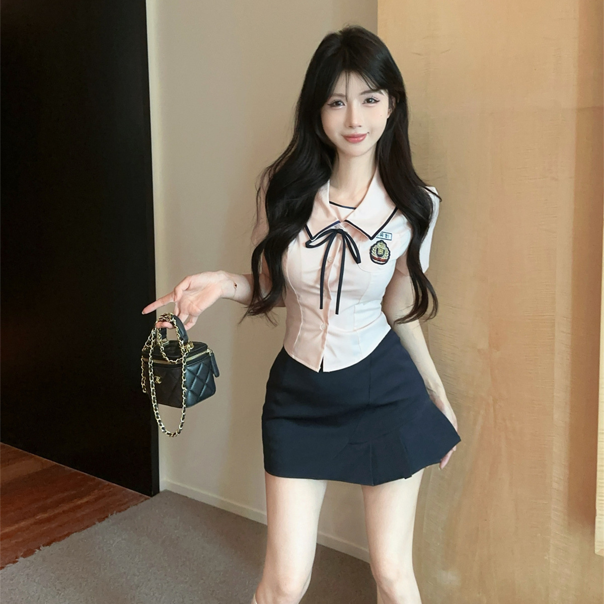 Летний новый корейский костюм в стиле JK, преппи, сладкий, сексуальный, с короткими рукавами, высокой талией и плиссированной юбкой.