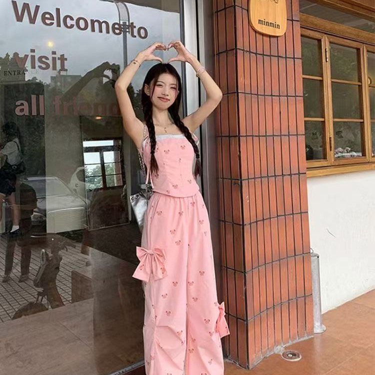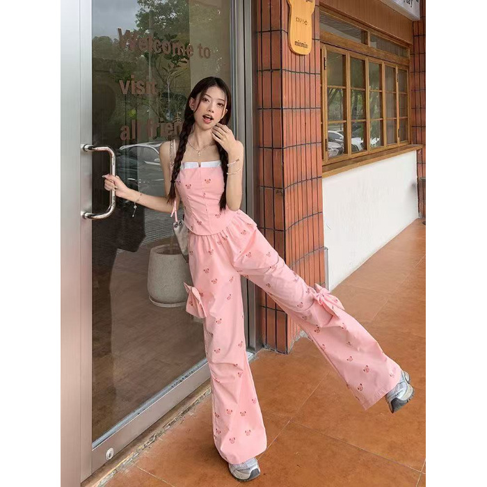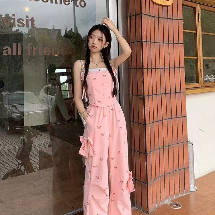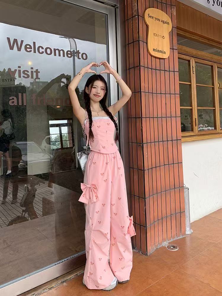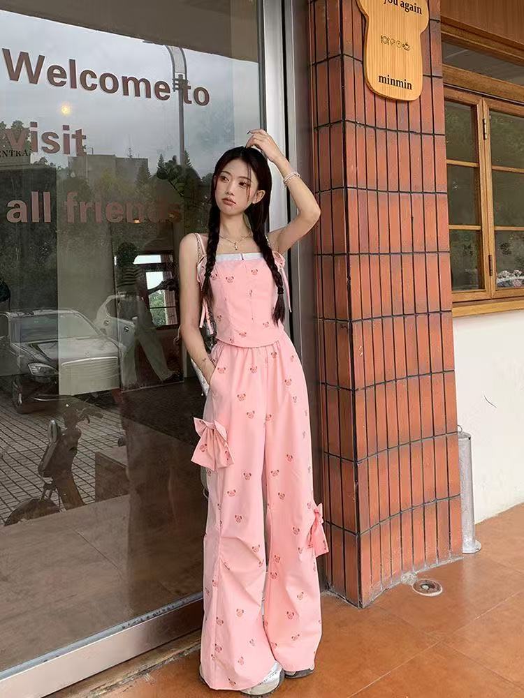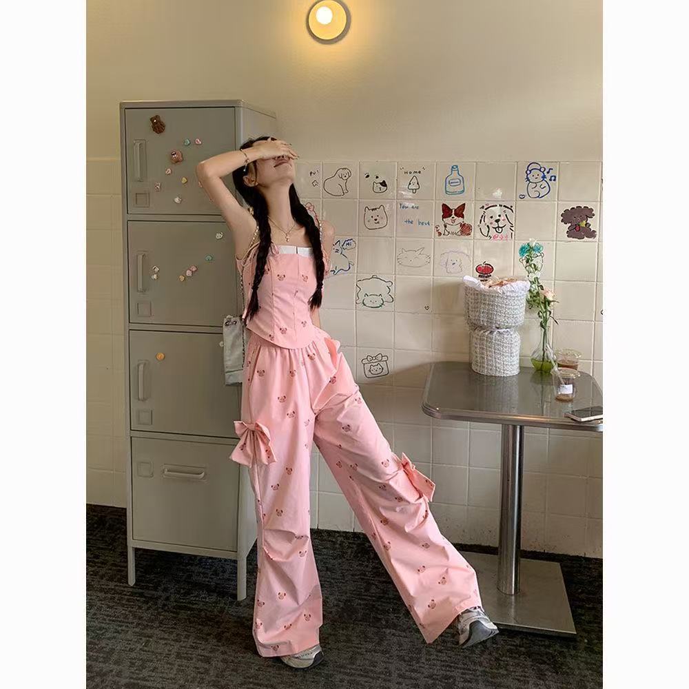 Летний костюм для женщин в сладко-пряном стиле: розовый топ с медвежонком, бантом, широкие брюки, повседневный комплект из двух предметов для работы.