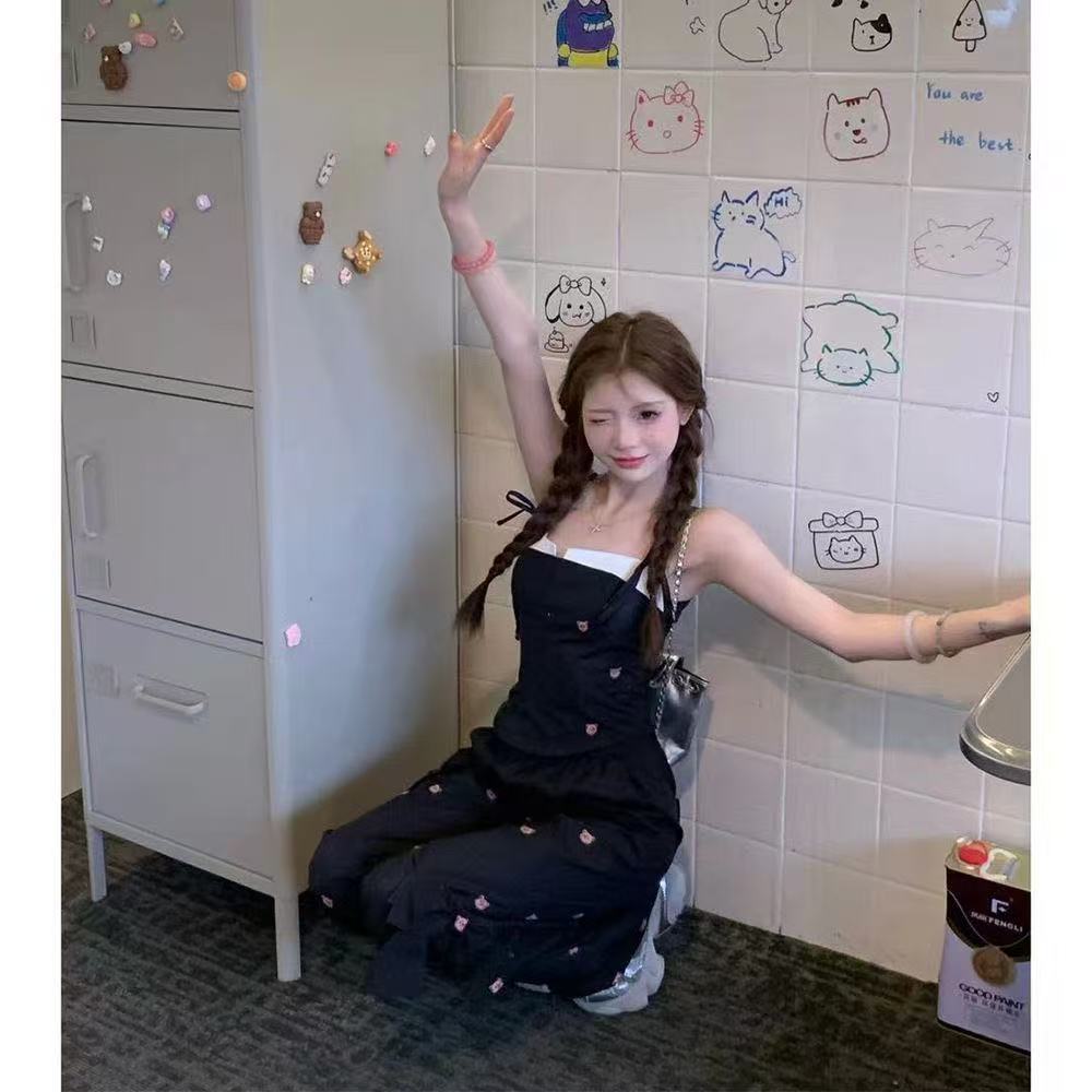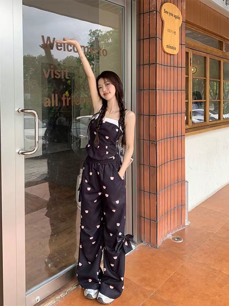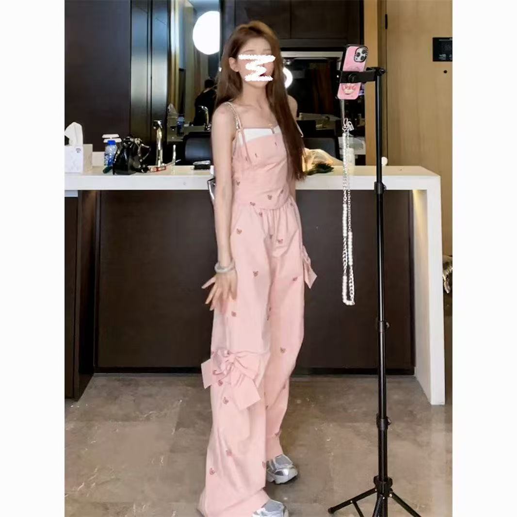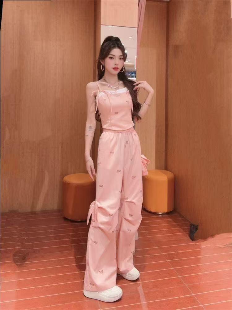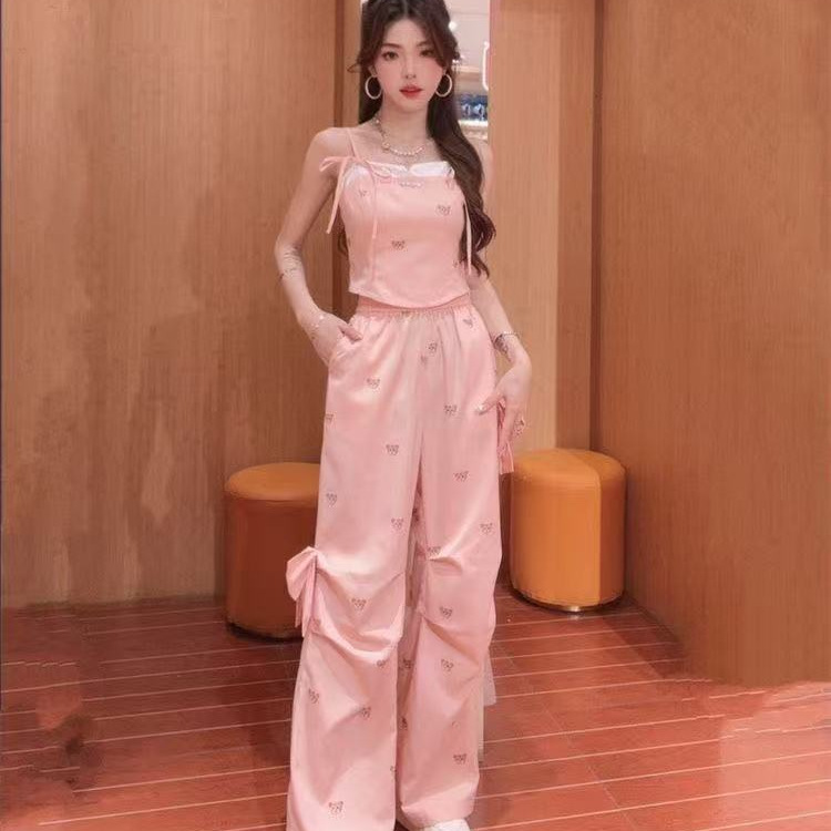 Летний костюм для женщин в сладко-пряном стиле: розовый топ с медвежонком, бантом, широкие брюки, повседневный комплект из двух предметов для работы.