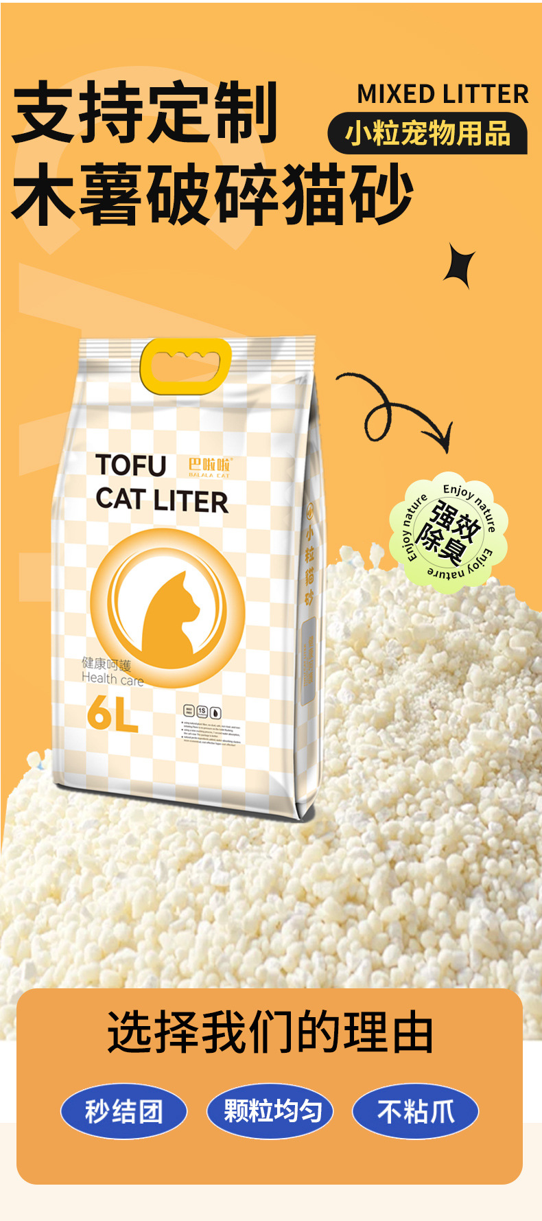 Оптовая продажа наполнителя для кошачьих туалетов из мелкодисперсного измельченного картофеля (кассавы), мгновенно комкующийся, с низким содержанием пыли, сильной впитываемостью, смешанный растительный наполнитель для кошек.