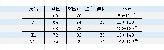 S (китайский код 95~110); М (китайский код 110~120); L (китайский код 120~130); XL (китайский код 130~140); 2XL (китайский код 140~150)