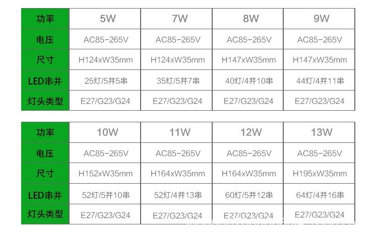 Г24----5 Вт (25 бусин); Г24----7 Вт (35 бусин); Г24----9 Вт (44 бусины); Г24----10 Вт (50 бусин); Г24----12 Вт (60 бусин); Г24----13 Вт (64 бусины); Е27----5 Вт (25 бусин); Е27----7 Вт (35 бусин); Е27----9 Вт (44 бусины); Е27----10 Вт (50 бусин); Е27----12 Вт (60 бусин); Е27----13 Вт (64 бусины)