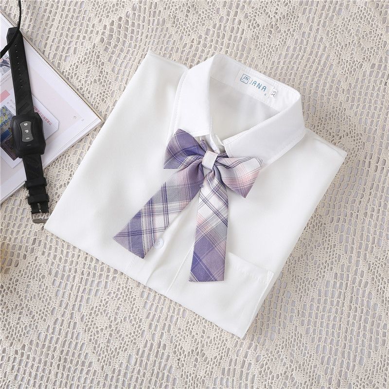 Белая рубашка + светло-фиолетовый клетчатый галстук-бабочка; одинарная белая рубашка; Белая рубашка + черный галстук; Белая рубашка + черный галстук-бабочка с длинной ручкой.; Белая рубашка + светло-серый клетчатый галстук.; Белая рубашка + светло-серый клетчатый бант.; Белая рубашка + голубой клетчатый галстук.; Белая рубашка + голубой клетчатый бант; Белая рубашка + светло-розовый клетчатый галстук.; Белая рубашка + светло-розовый клетчатый бант; Белая рубашка + галстук с лимонной морской солью; Белая рубашка + бантик в клетку светло-абрикосового цвета.; Белая рубашка + клетчатый галстук «мяу»; Белая рубашка + темно-синий клетчатый бант.; Белая рубашка + галстук «Бессмертный Сычуань».; Белая рубашка + сине-белый клетчатый бант.; Белая рубашка + галстук в клетку таро; Белая рубашка + фиолетово-розовый клетчатый бант; Белая рубашка + клетчатый галстук Hoshino