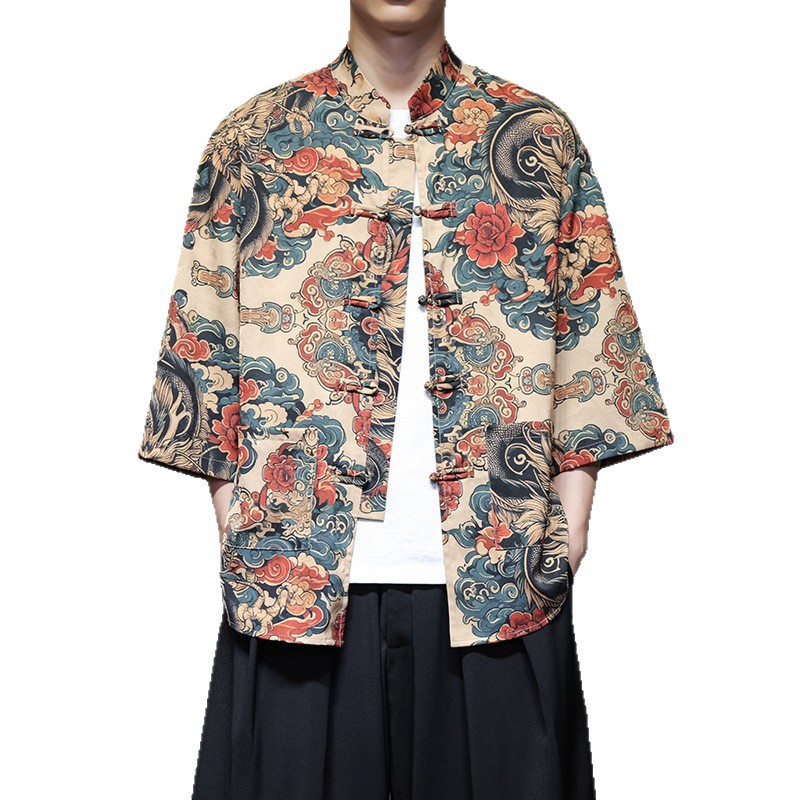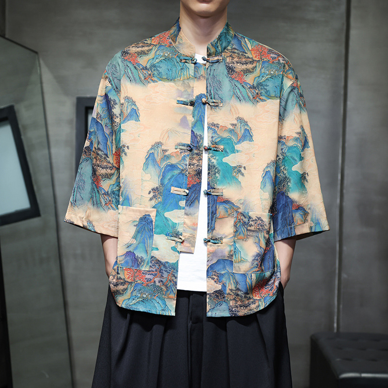Новая мужская рубашка в китайском стиле с коротким рукавом, летняя рубашка-танка из ледяного шелка с традиционными китайскими пуговицами и цветочным узором.