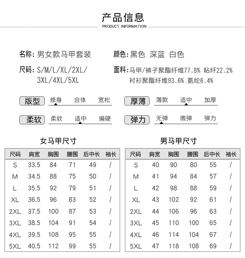 Мужской/черный жилет; Мужчины/Синий жилет; Женский/черный жилет; Женский/синий жилет; Мужчины/Черные брюки; Мужчины/Синие брюки; Женщины/Черные брюки; Женщины/Синие брюки; Мужчины/белая рубашка; Женщины/Белая рубашка