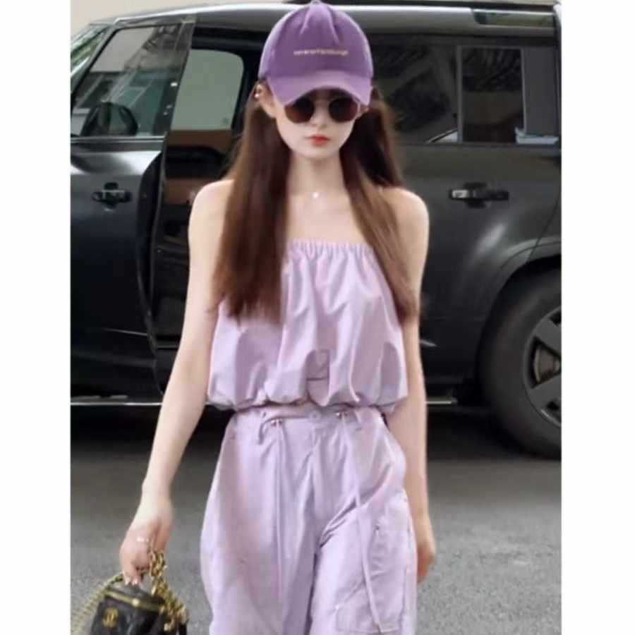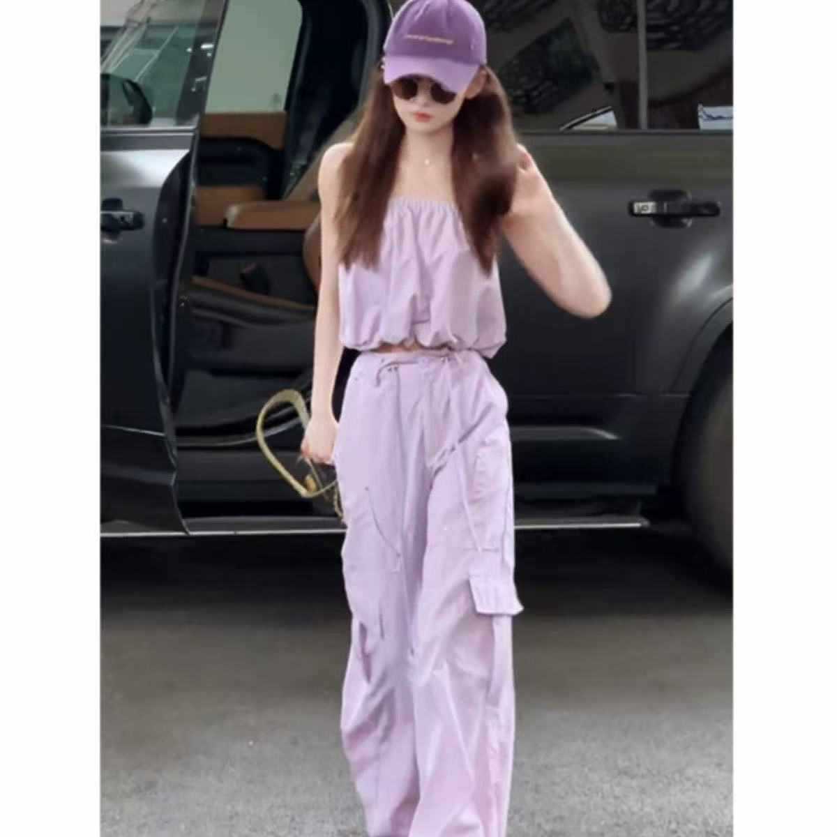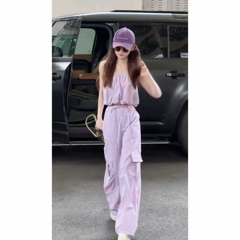 Pure Desire, стильный повседневный костюм для девочек, женский короткий пышный топ на подтяжках, широкие брюки, комплект из двух предметов, летний женский костюм