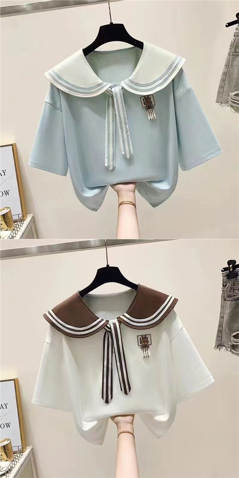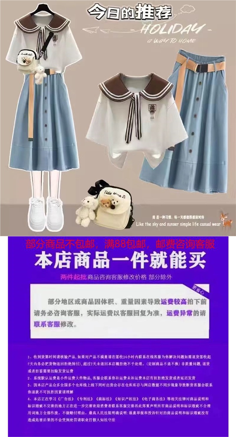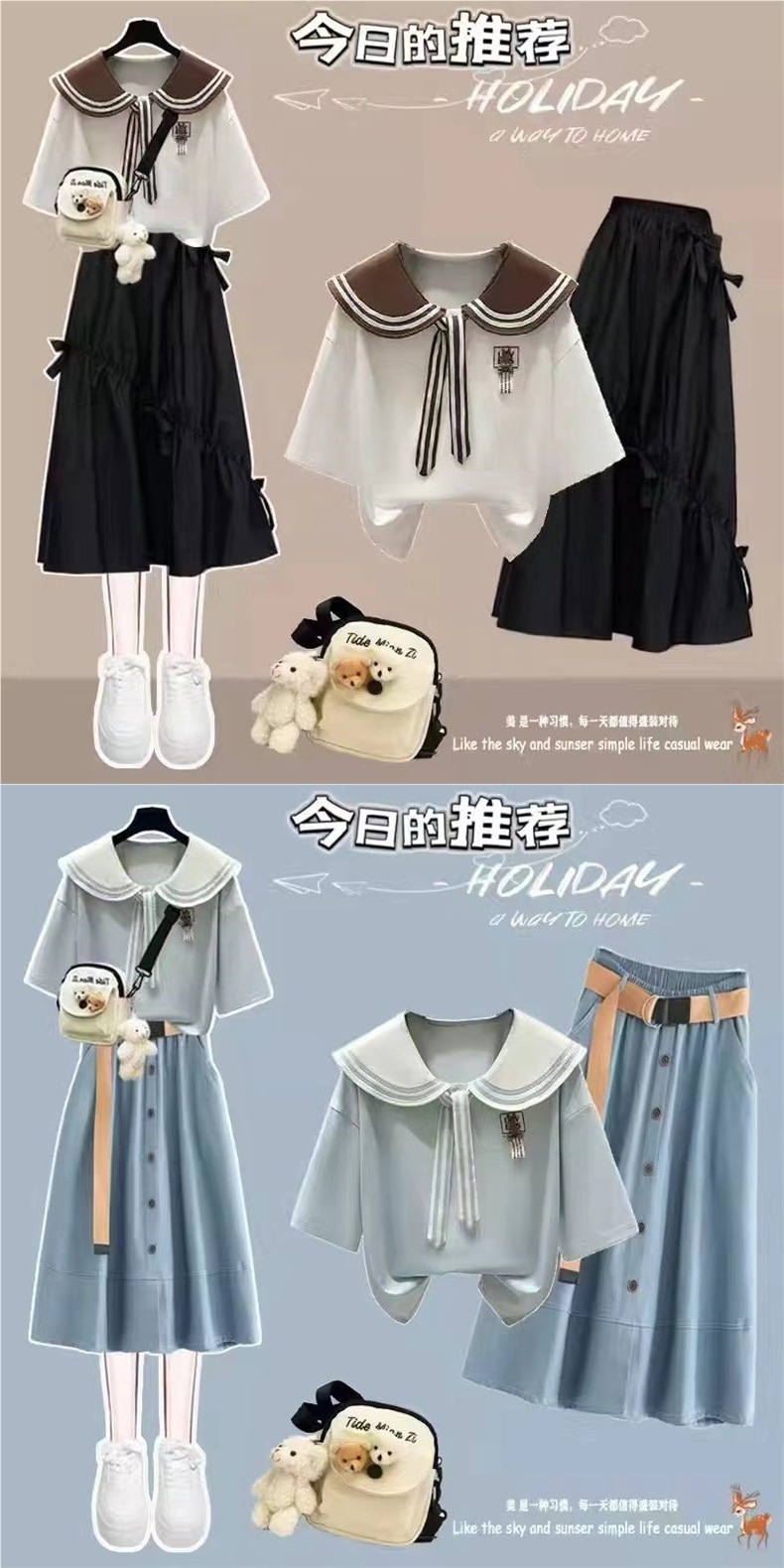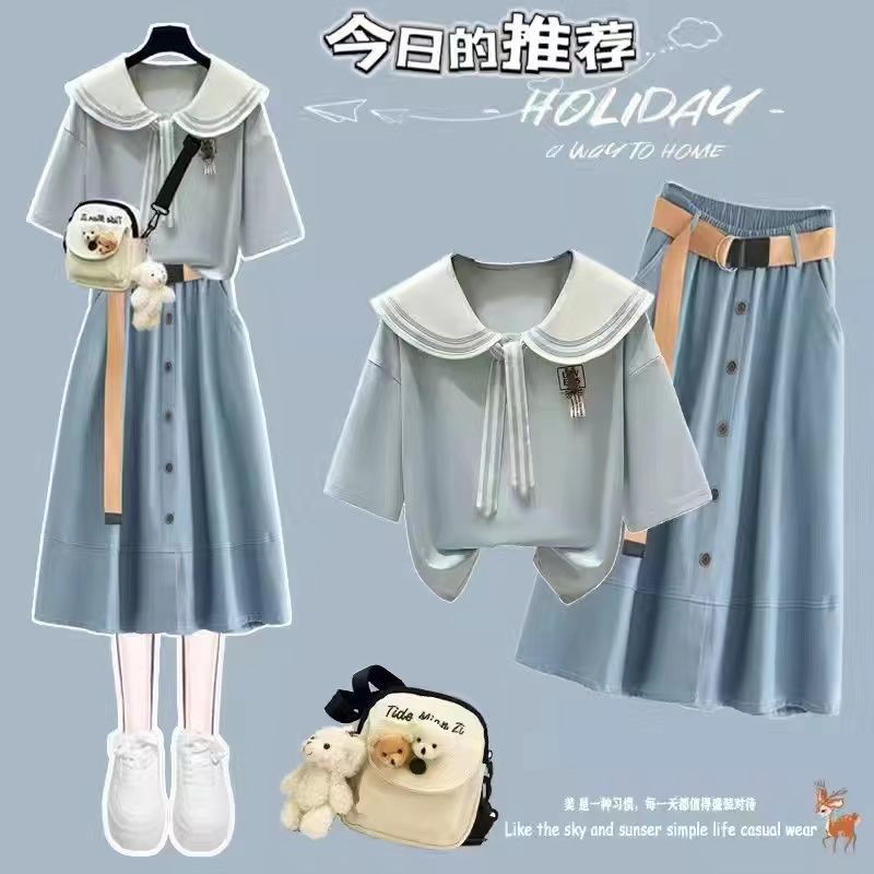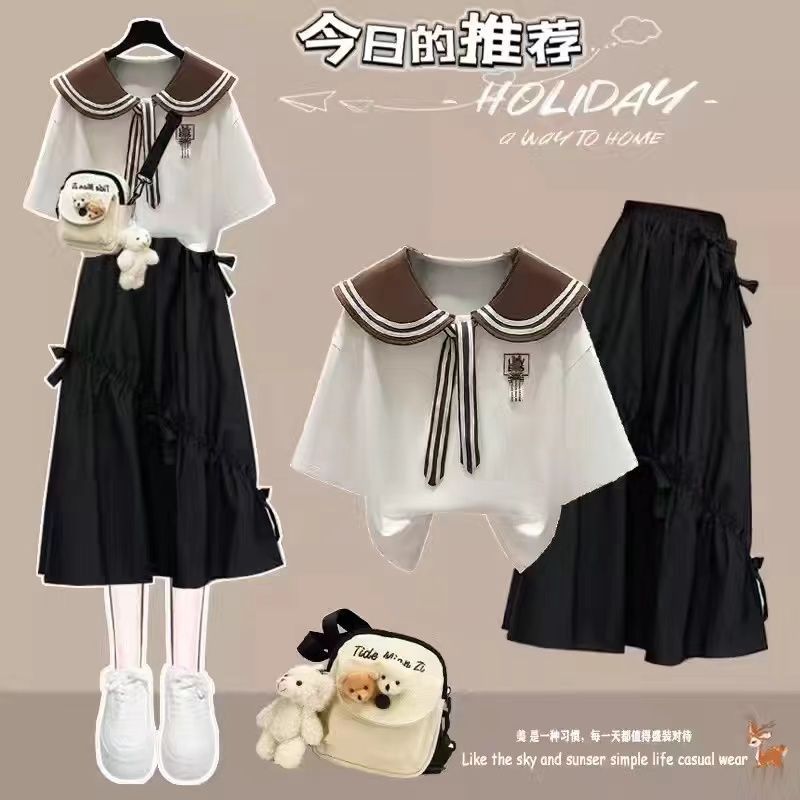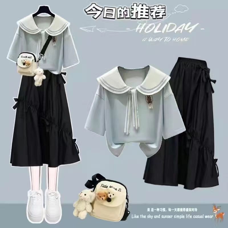 Лето 2024, свежий стильный костюм для студенток, корейский стиль, свободный студенческий стиль, темно-синяя футболка с воротником + юбка, комплект из двух предметов