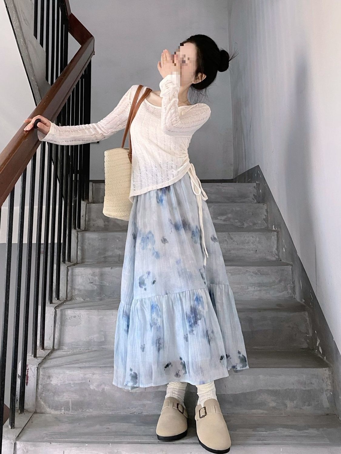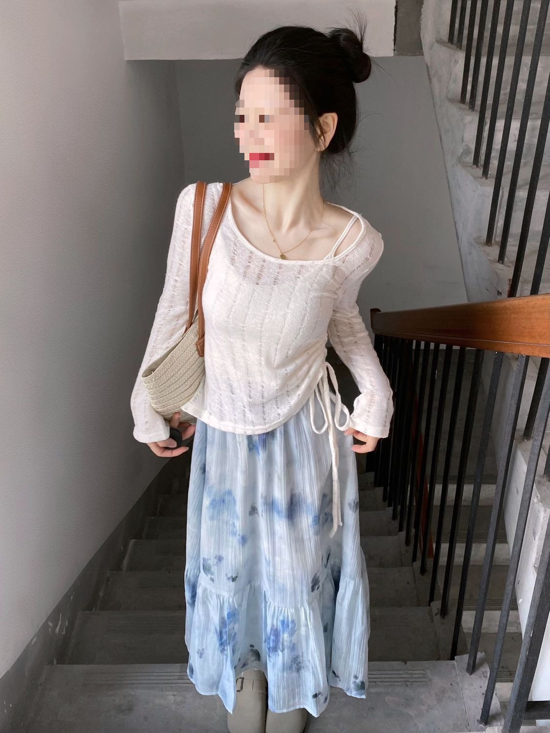 Блузка с длинными рукавами и юбка миди в качестве внутренней одежды.