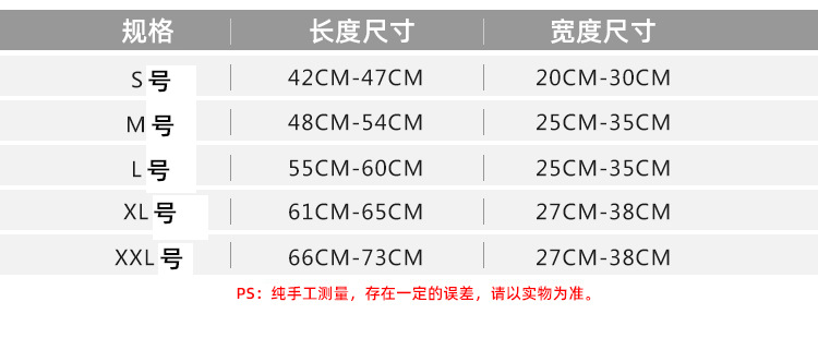 Размер S: 47см*30см; Размер М: 54см*35см; Размер L: 60см*38см; Код XL: 65*38 см; Код XXL: 73см*38см