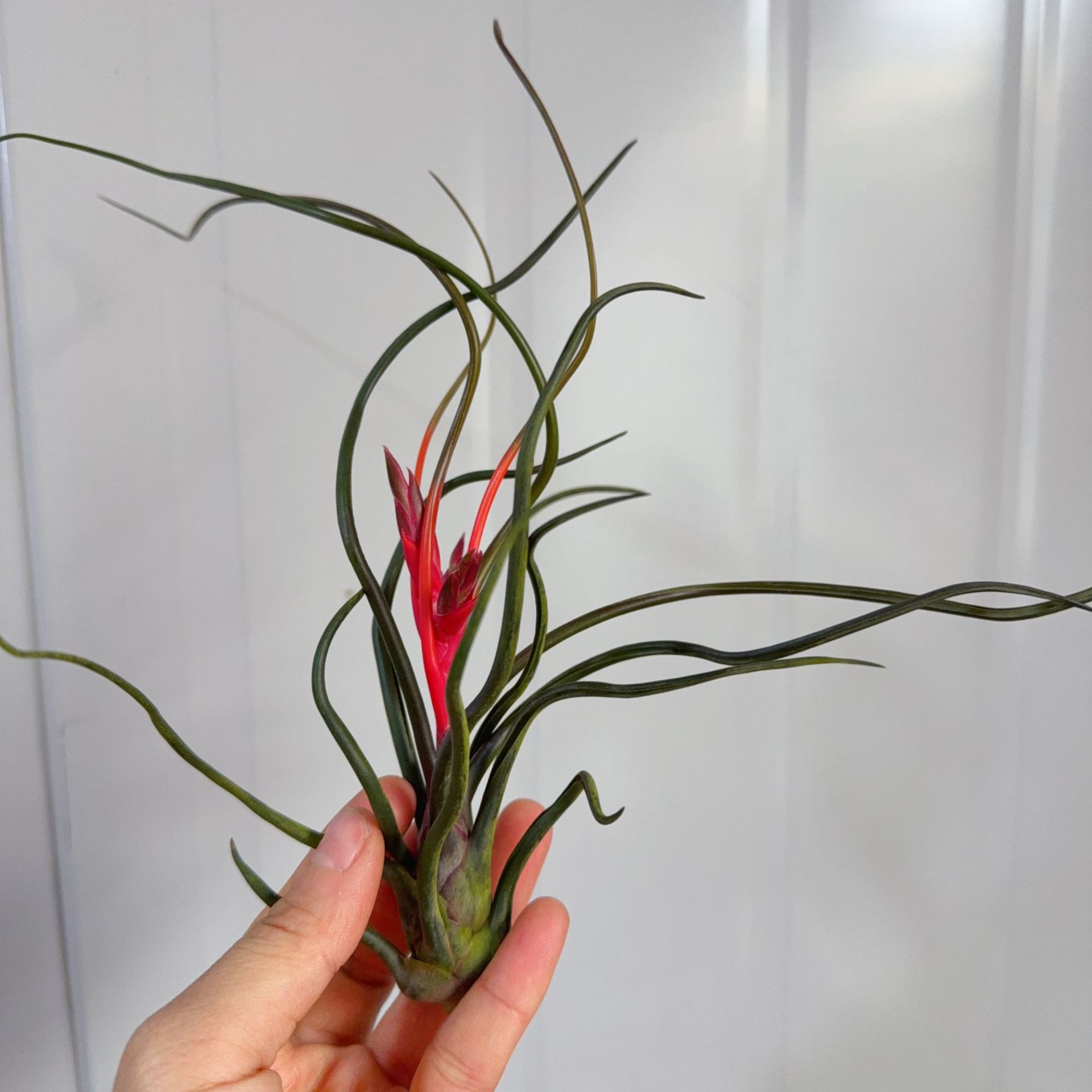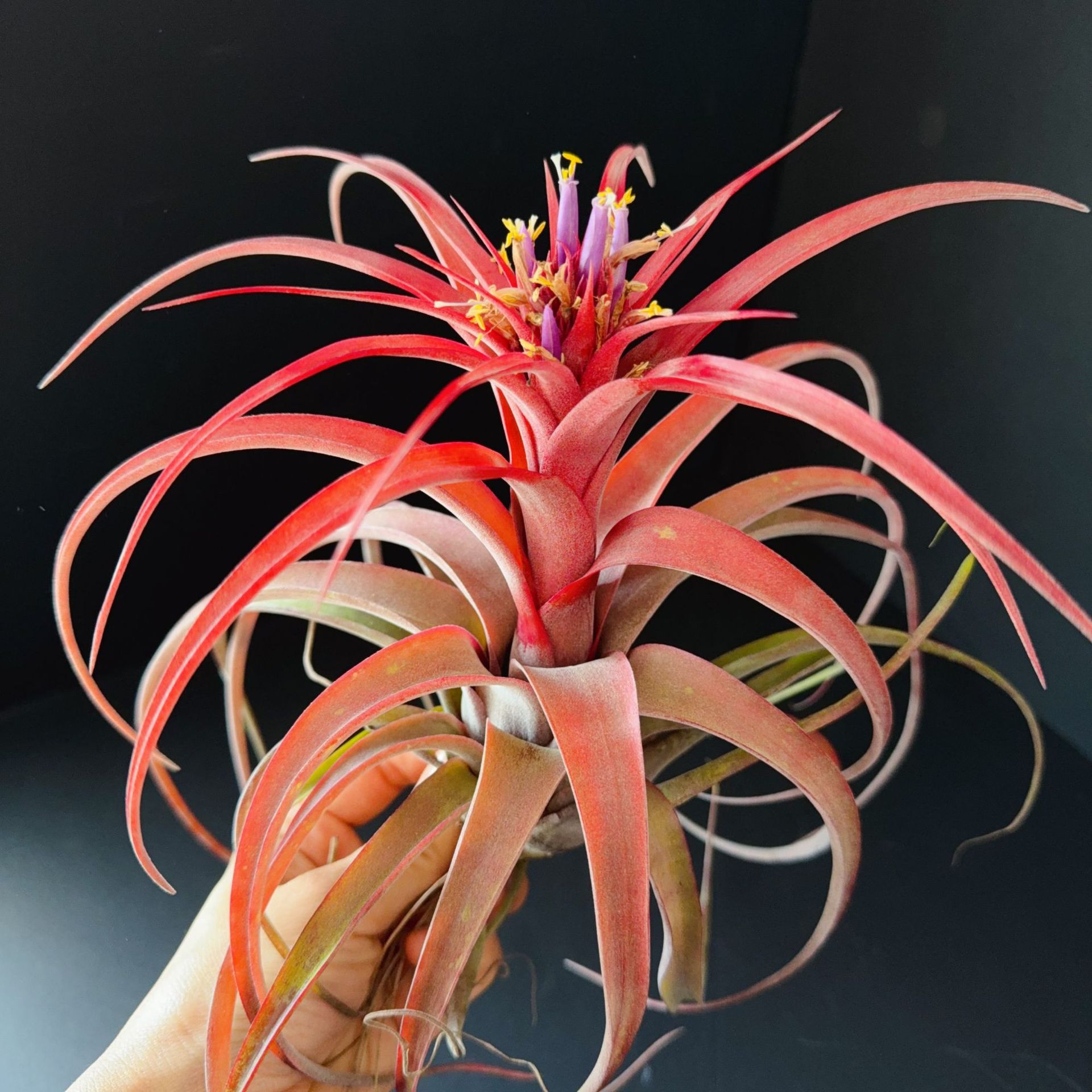 关于空气凤梨花期,每株空气凤梨一生只开花一次,作为观叶以及无土植物,空气凤梨养分受限,在分配养分去供给开花的时候会比较保守,花朵相对没有那么艳丽,但胜在小小的无土植物一样可以开出花朵来,极具生命力,大型空气凤梨的花期时间有些非常漫长,譬如大棵的霸王香槟等,从花箭开始到花期结束可能长达一年之久,小型空凤花期较短,并受季节温度影响,每个品种或者每株植物花期时间不固定,有些还是小苗的一样可能开花,开花意味着停止长大开始繁殖,所以能保持许多年没有开花,个体长得比较大很不容易,稀有且市场价格较高。