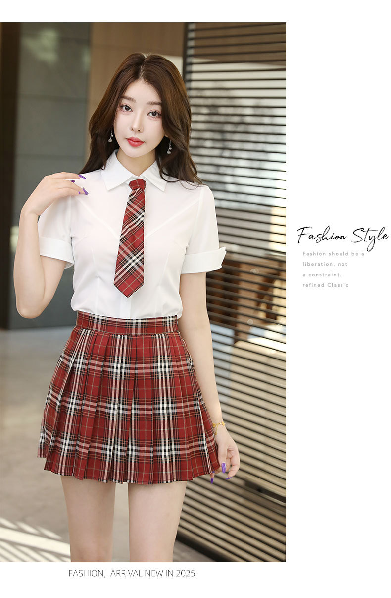 Белый топ/синяя клетчатая юбка; Белый топ/красная клетчатая юбка; Белый топ/темно-серая клетчатая юбка; белая рубашка; синяя клетчатая юбка; красная клетчатая юбка; Темно-серая юбка в клетку