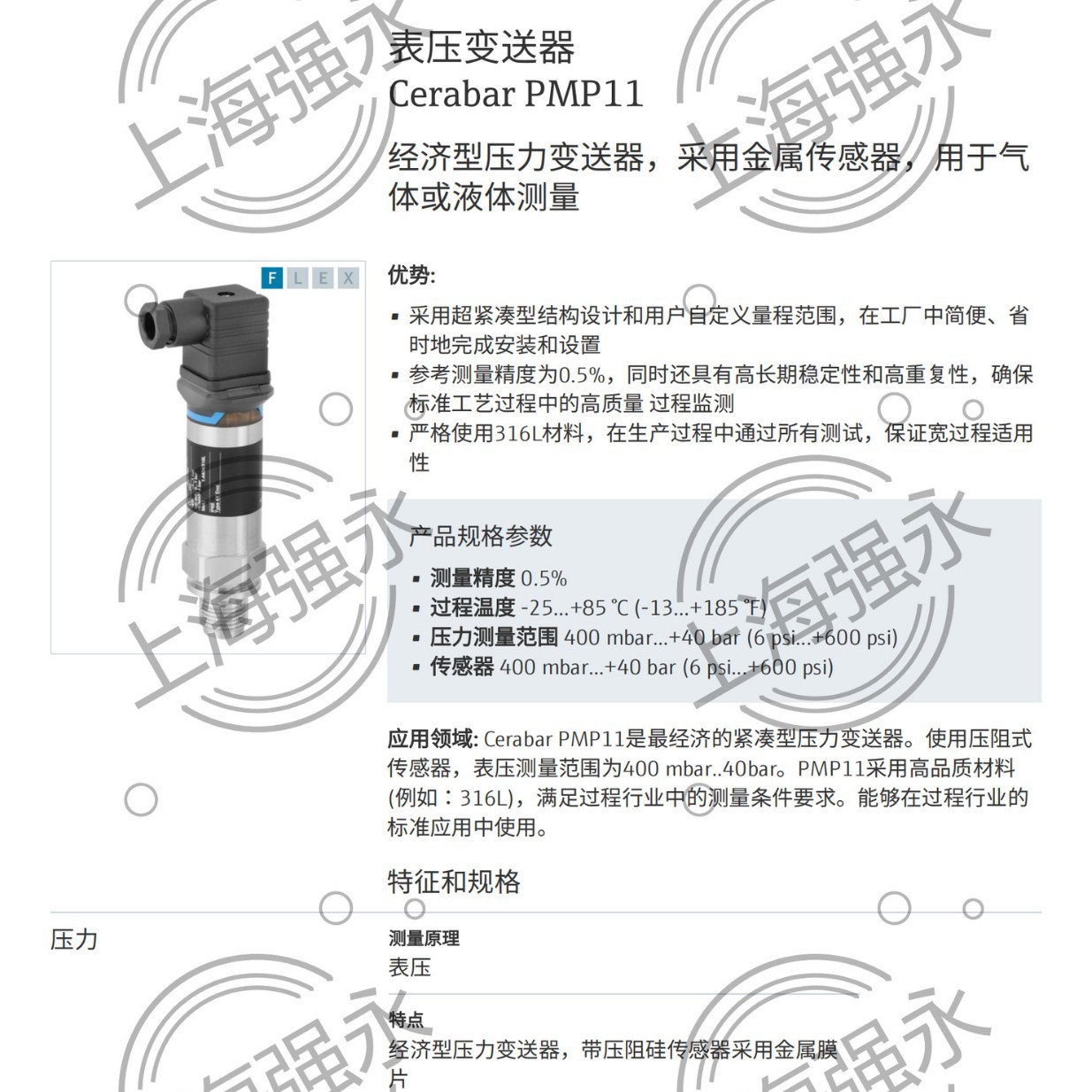 Cerabar PMP11是最经济的紧凑型压力变送器。使用压阻式传感器,表压测量范围为400 mbar..40bar。PMP11采用高品质材料(例如:316L),满足过程行业中的测量条件要求。能够在过程行业的标准应用中使用。