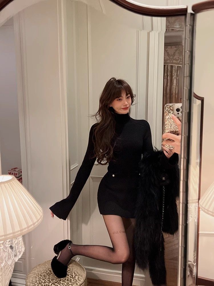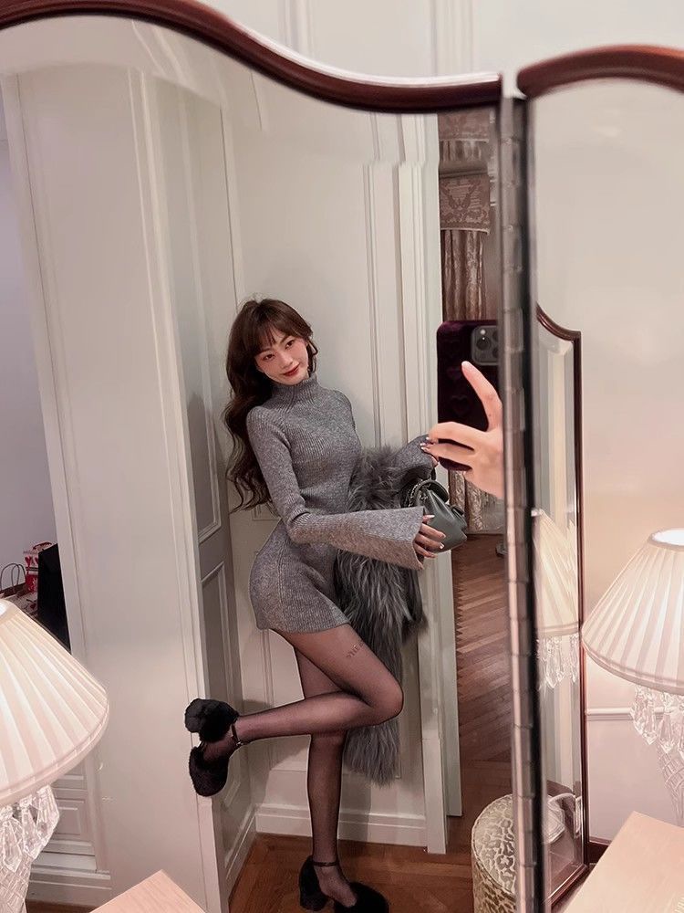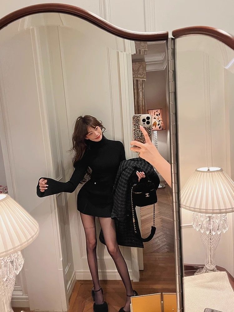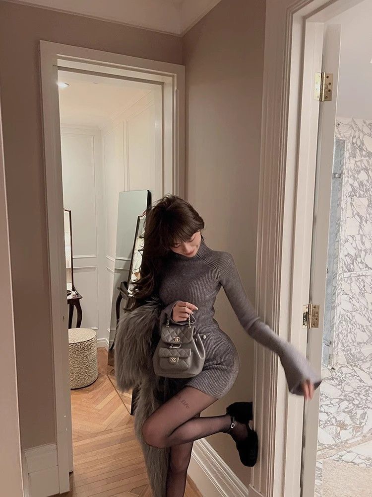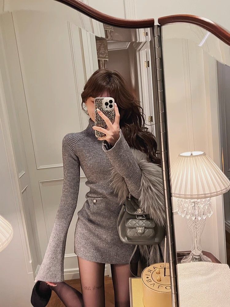 Трикотажное платье с высоким воротником для женщин, новый стиль осени и зимы 2024 года, миниатюрный внутренний слой, облегающая юбка.