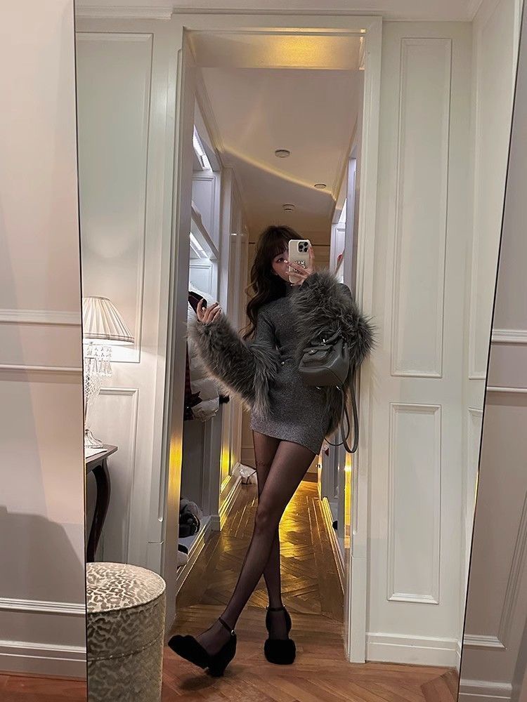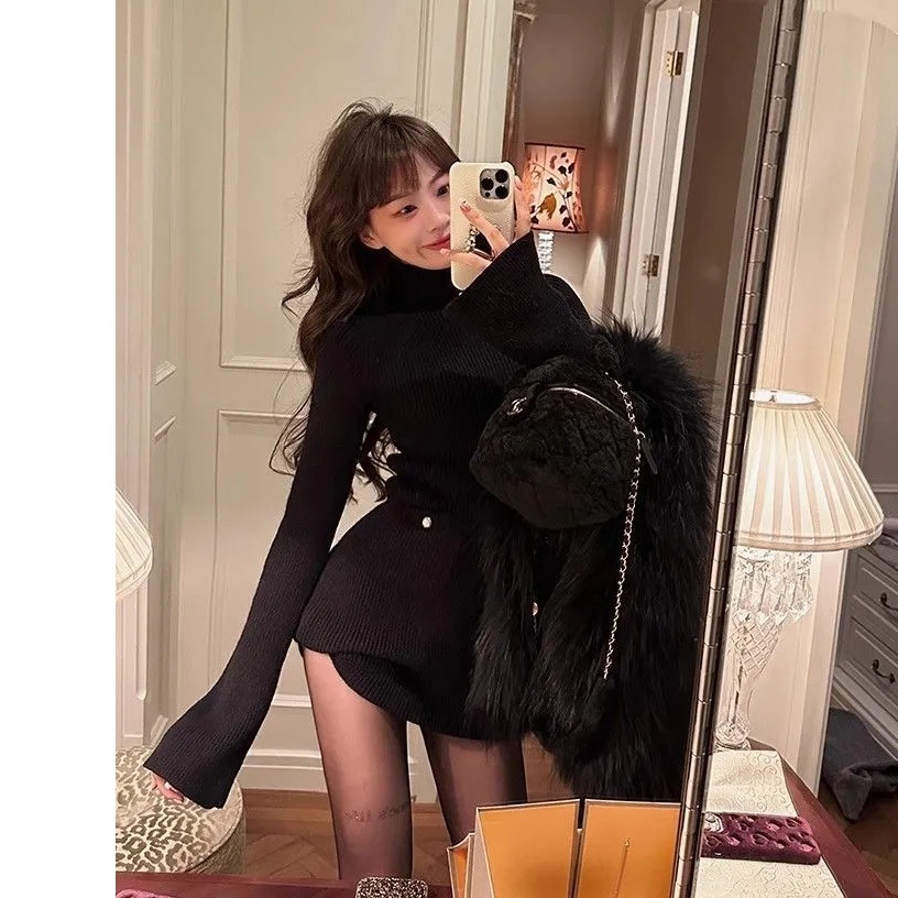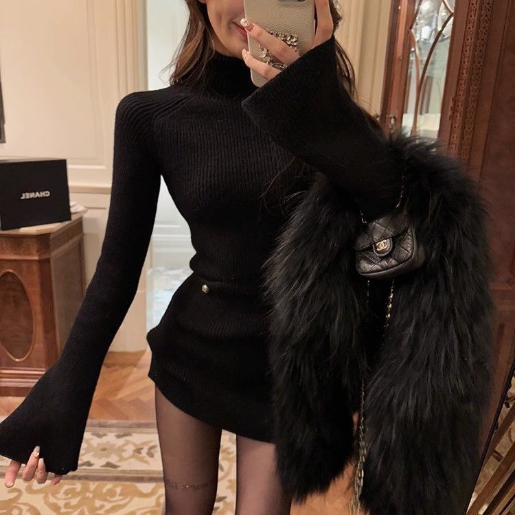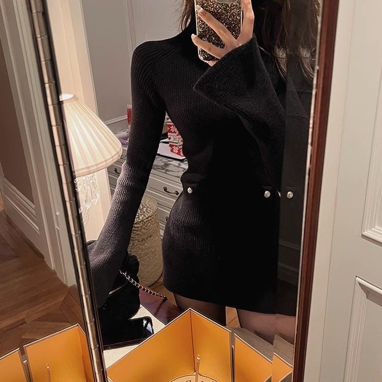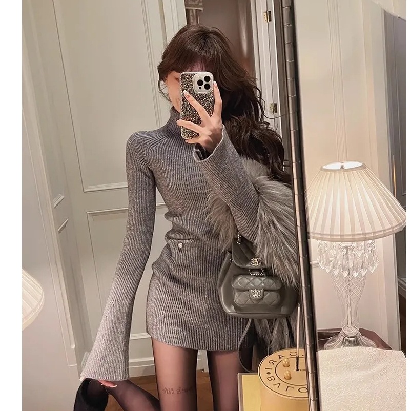 Трикотажное платье с высоким воротником для женщин, новый стиль осени и зимы 2024 года, миниатюрный внутренний слой, облегающая юбка.