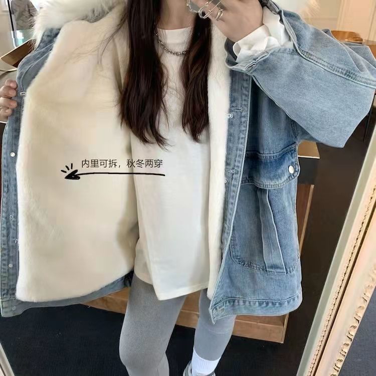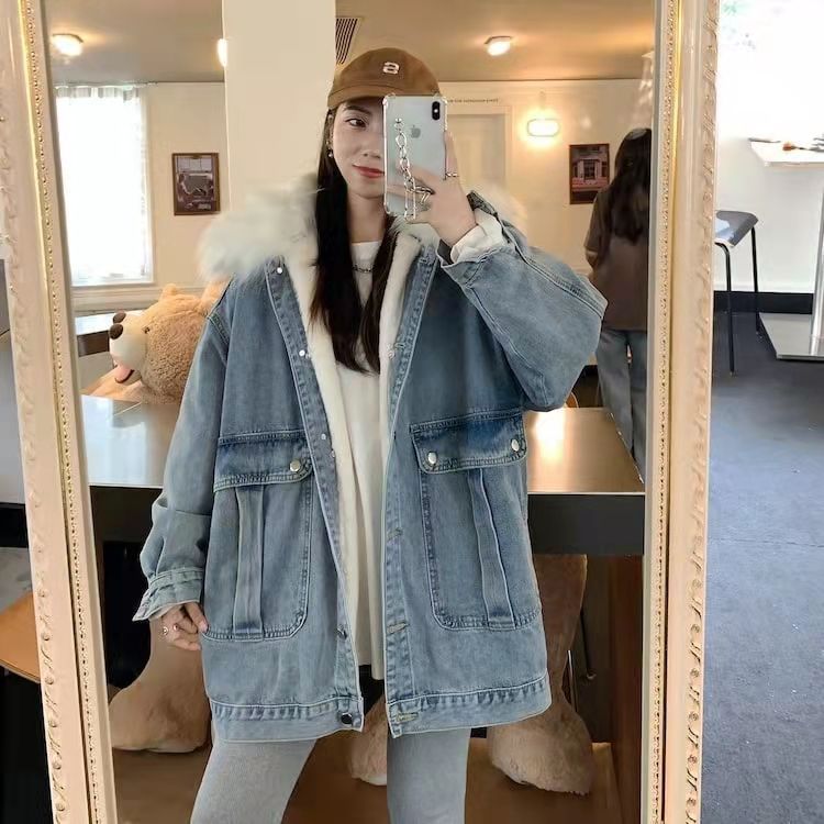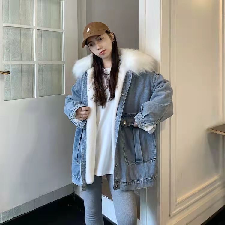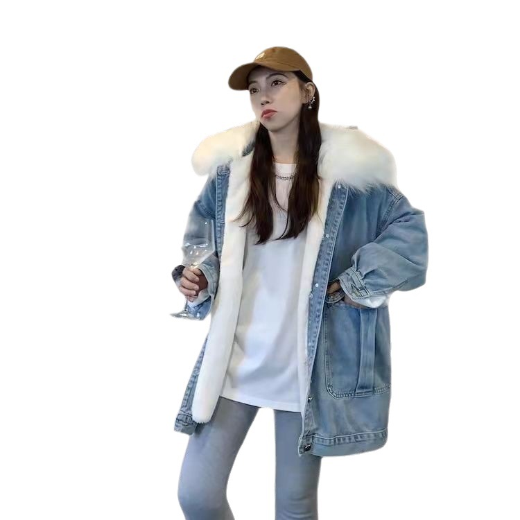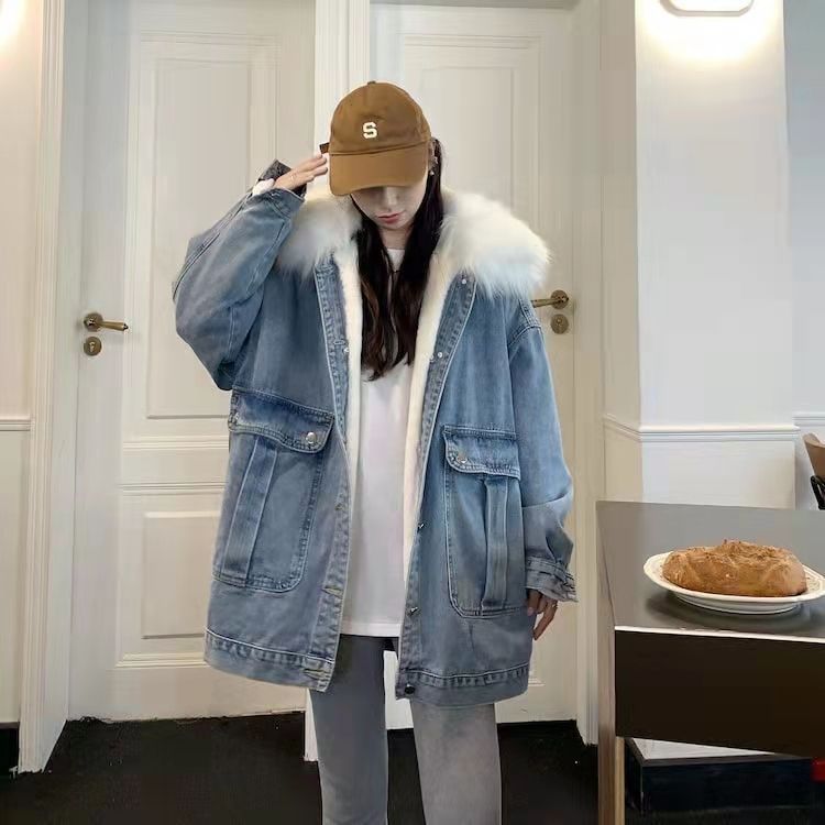 Джинсовая меховая верхняя одежда, женская осенне-зимняя свободная хлопковая верхняя одежда с большим меховым воротником, новая бархатная утолщенная хлопковая верхняя одежда, молодая мода