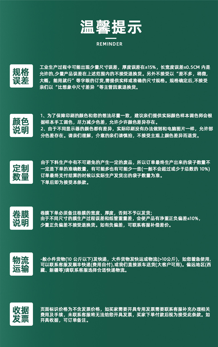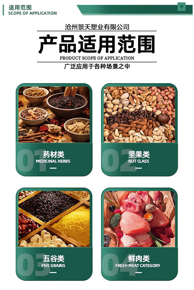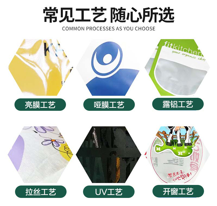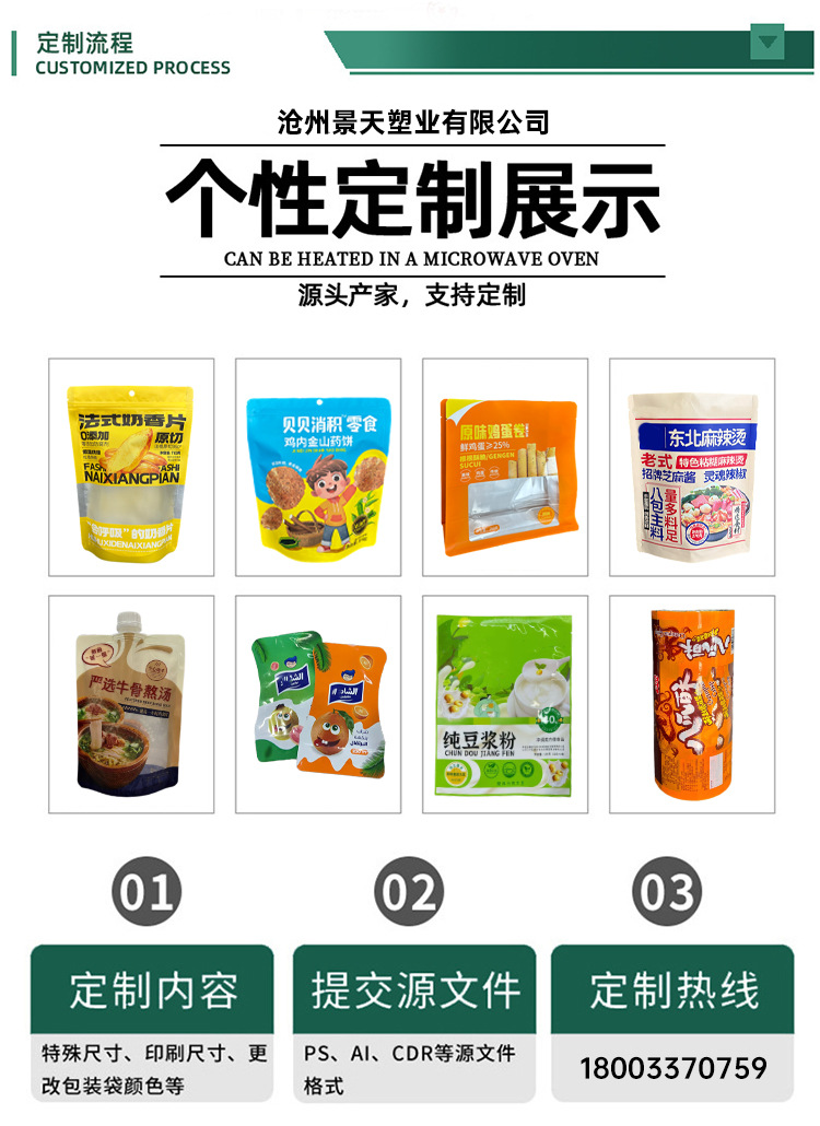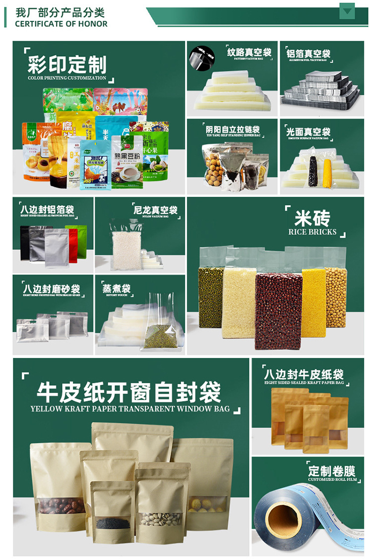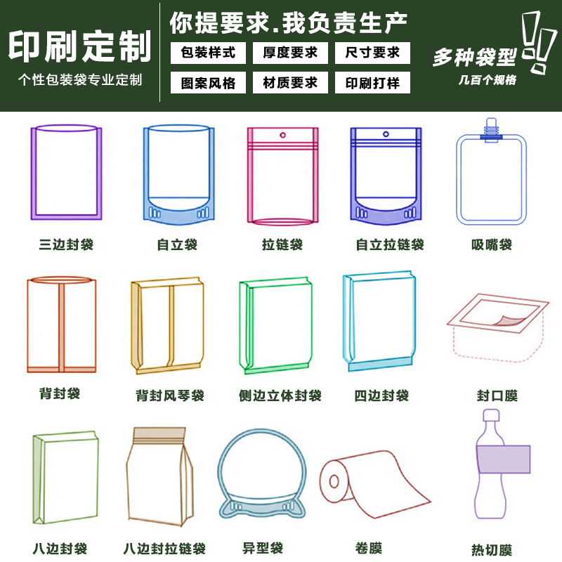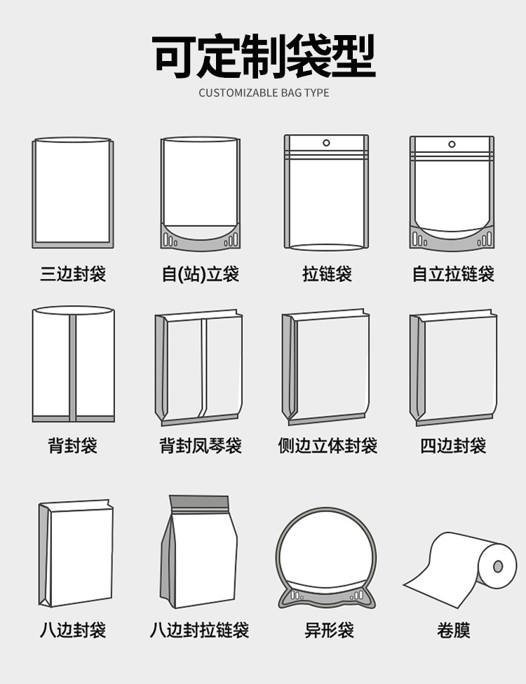 Индивидуальные трехсторонние герметичные пакеты; Индивидуальные отдельно стоящие пакеты с застежкой-молнией; Индивидуальный мешок с носиком; Индивидуальный пакет с задним уплотнением; Сумка-гармошка с задним уплотнением по индивидуальному заказу; Индивидуальный четырехсторонний герметичный пакет; Индивидуальный восьмисторонний герметичный пакет; Сумки специальной формы по индивидуальному заказу; Рулонная пленка по индивидуальному заказу; Изготовленная на заказ уплотнительная пленка